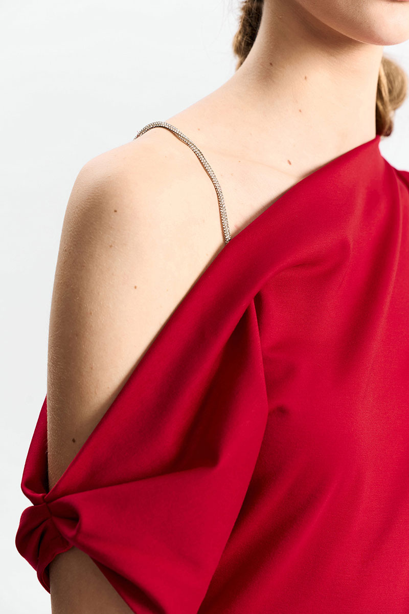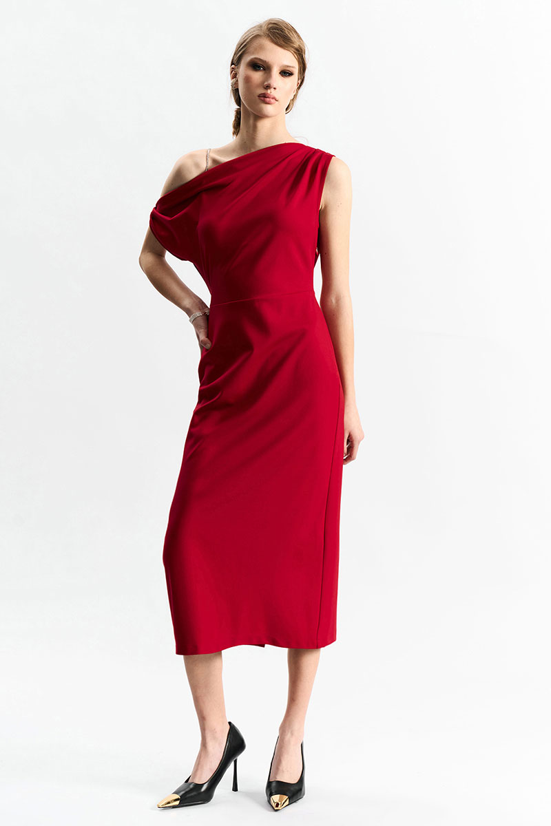 Платье прилегающего силуэта, с асимметричным вырезом горловины, длина "миди". Верхняя часть платья - отрезная. По плечевым срезам оформлены декоративные складки. Юбка с разрезом сзади