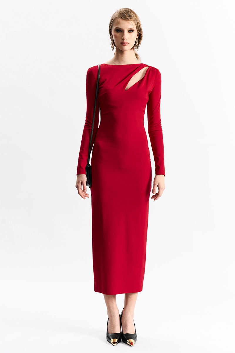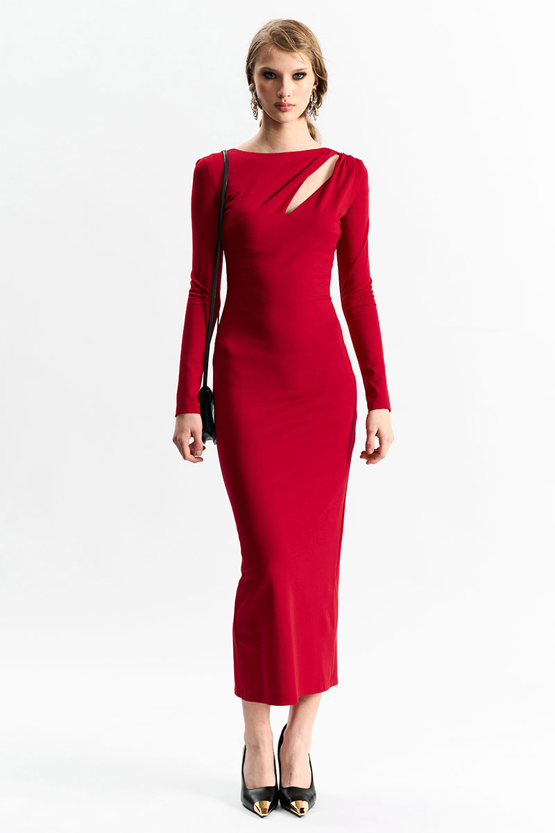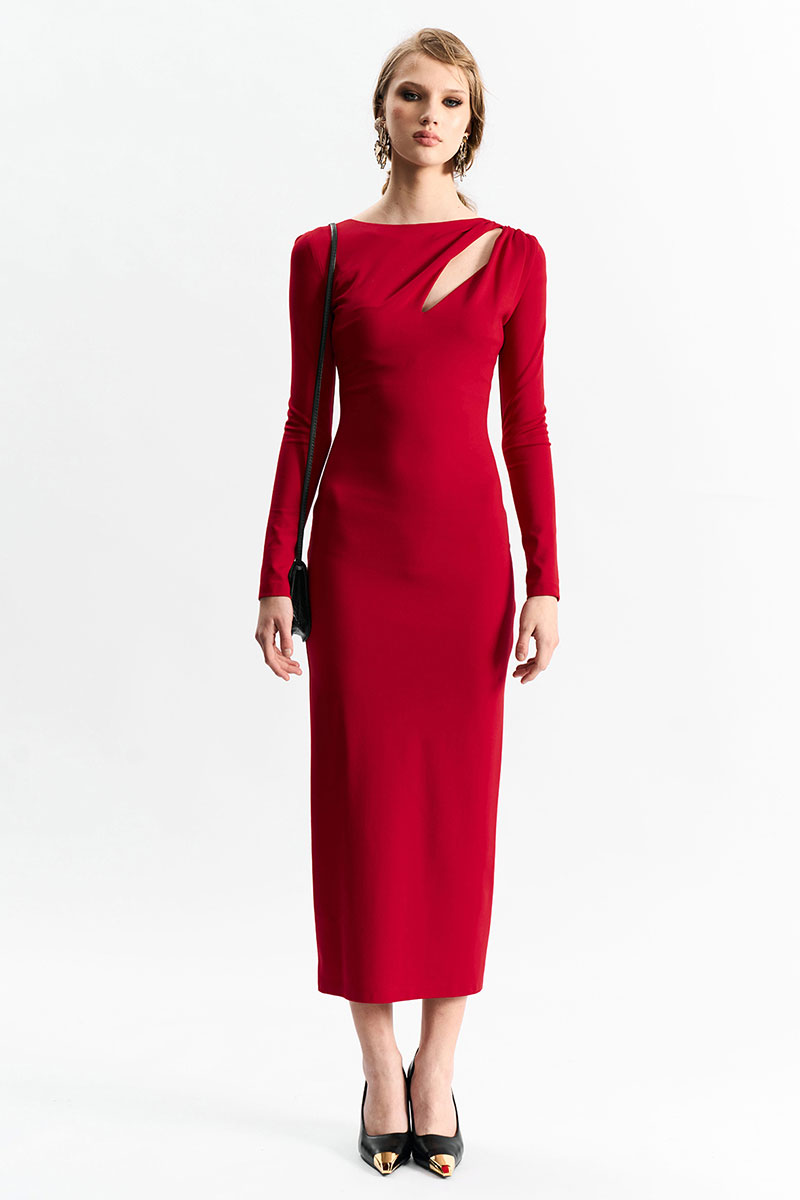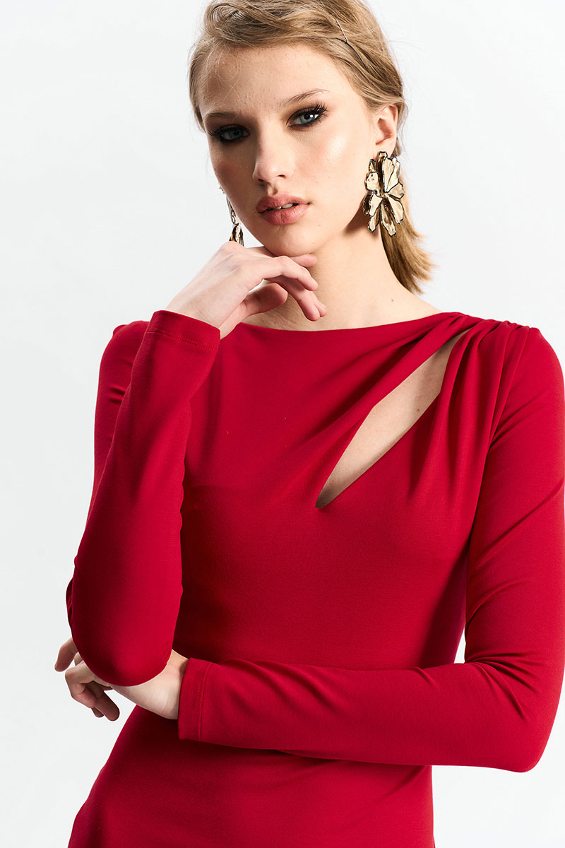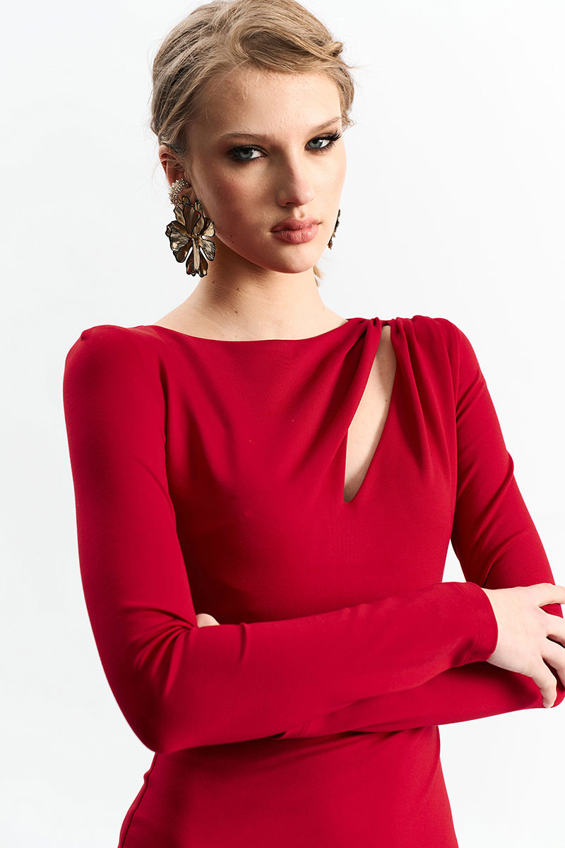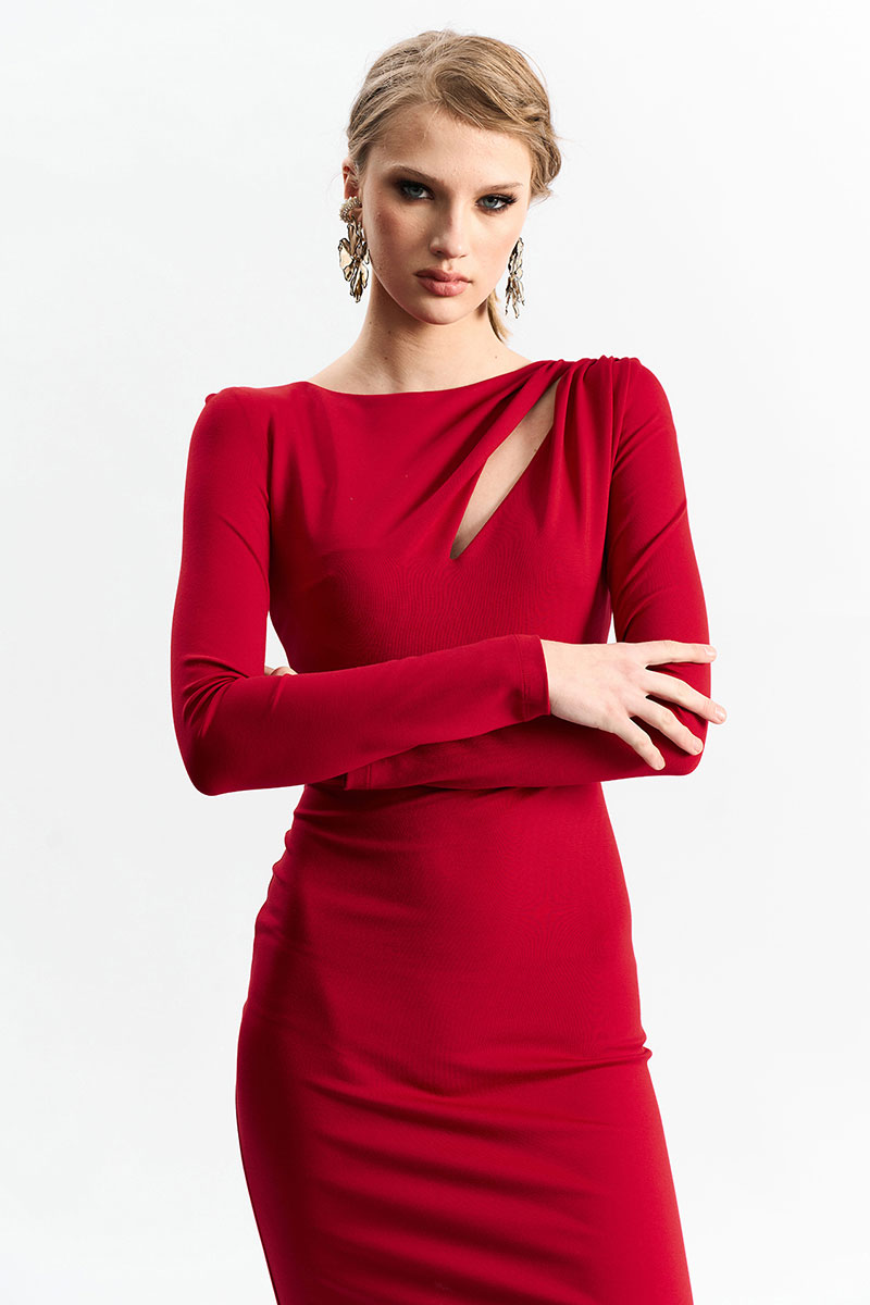 Платье трикотажное, прилегающего силуэта, с застежкой-молнией по спинке. Декоративный вырез-"капля" от плеча. Вырез обработан подкладкой.