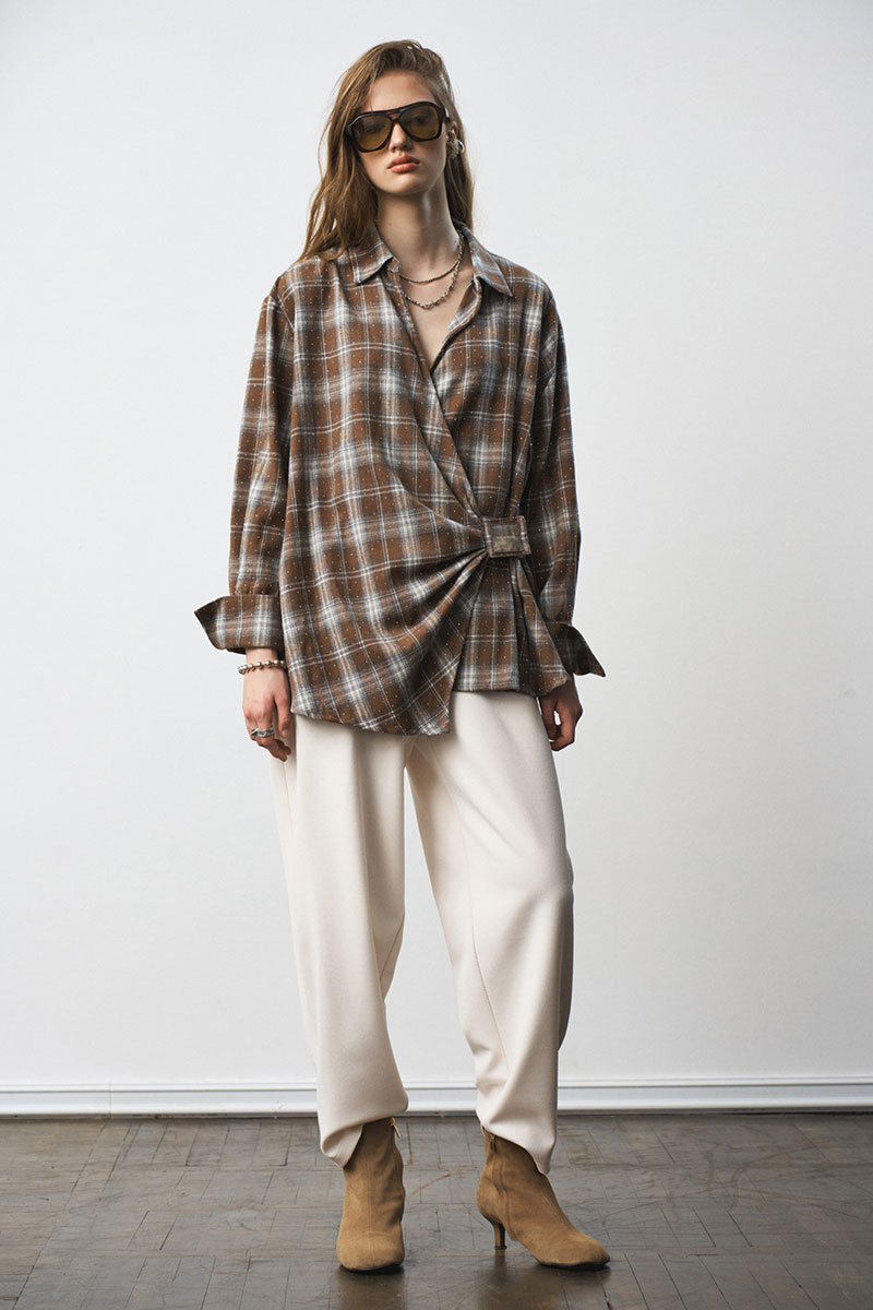 Рубашка из мягкой хлопковой фланели со стразами, асимметричной застежкой на "липучке", и декоративными складками. Свободный силуэт.
