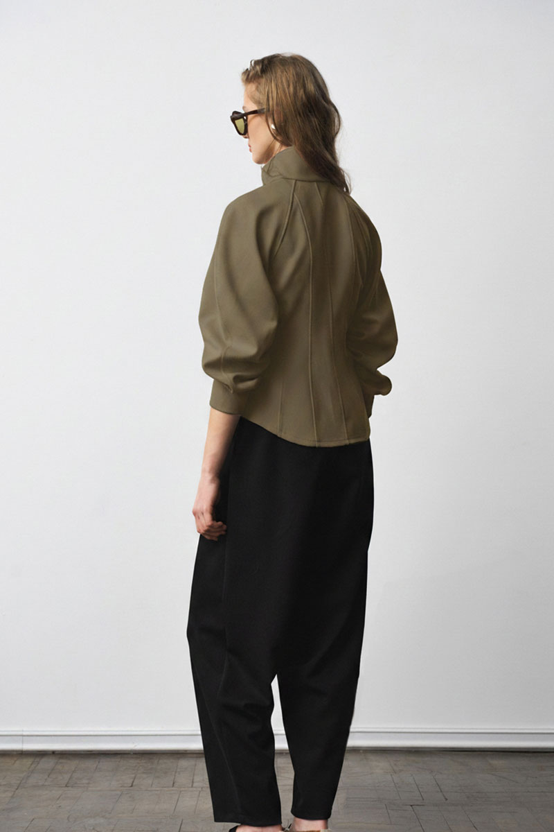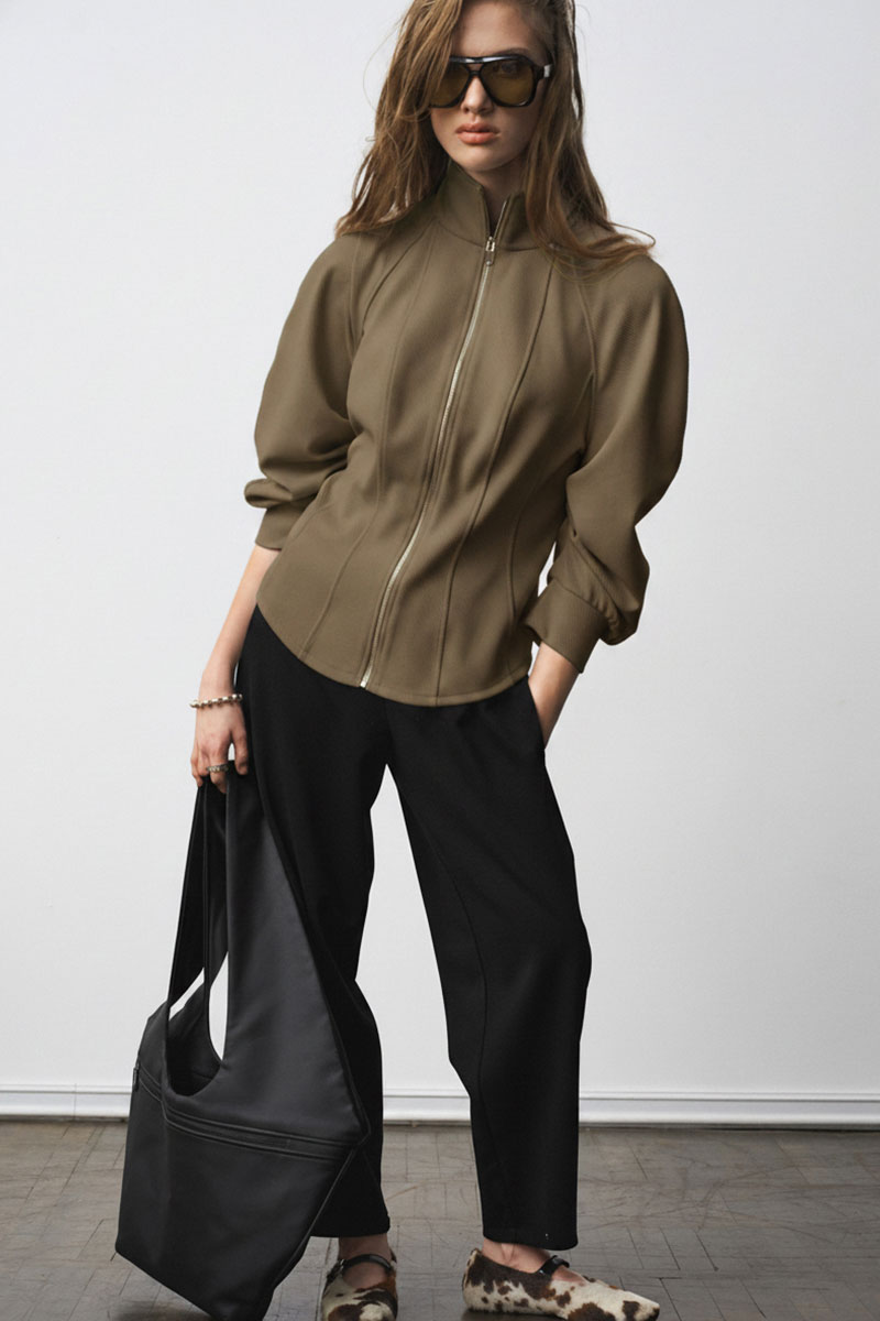 Джемпер прилегающего силуэта с воротником-стойкой, по рукаву заложенны конструктивные складки, образующие сборку. Застежка - на металлическую молнию. Материал - плотный трикотаж в рубчик.