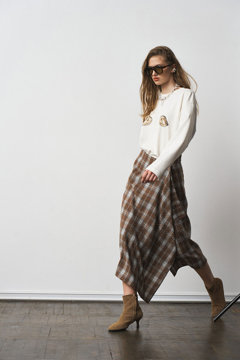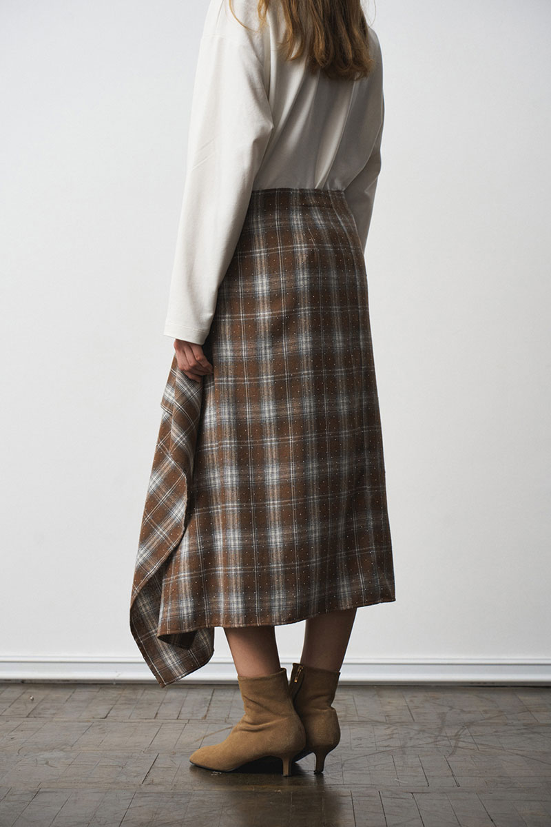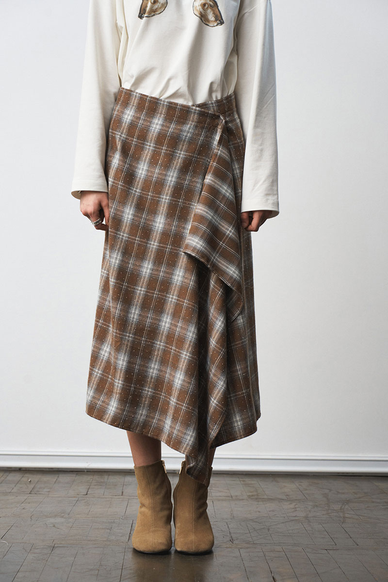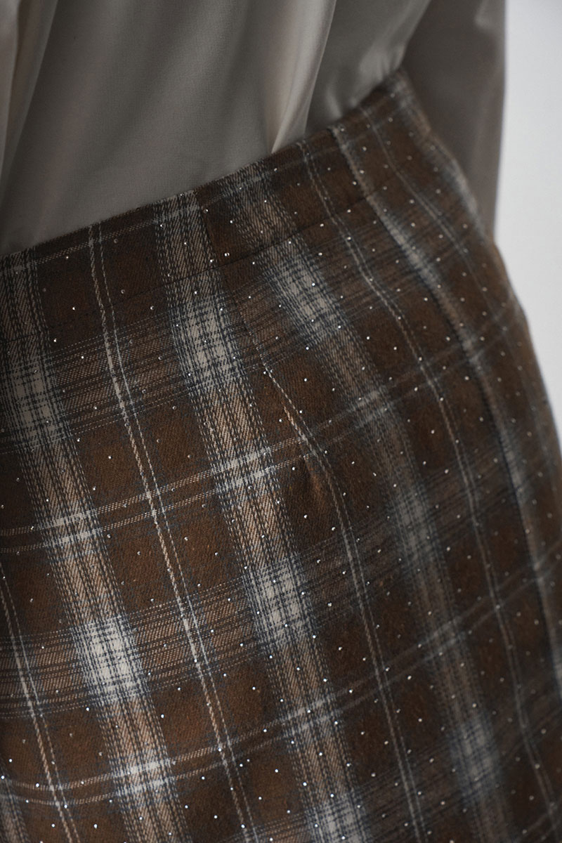 Юбка прямого силуэта, умеренного объема. Юбка выполнена "на запах". Застежка - асимметричная, две кнопки. Длина - миди. Материал - фланель со стразами.
