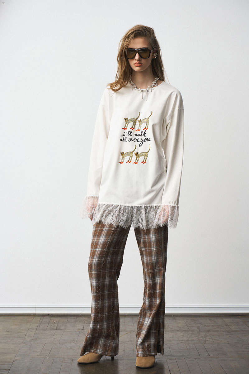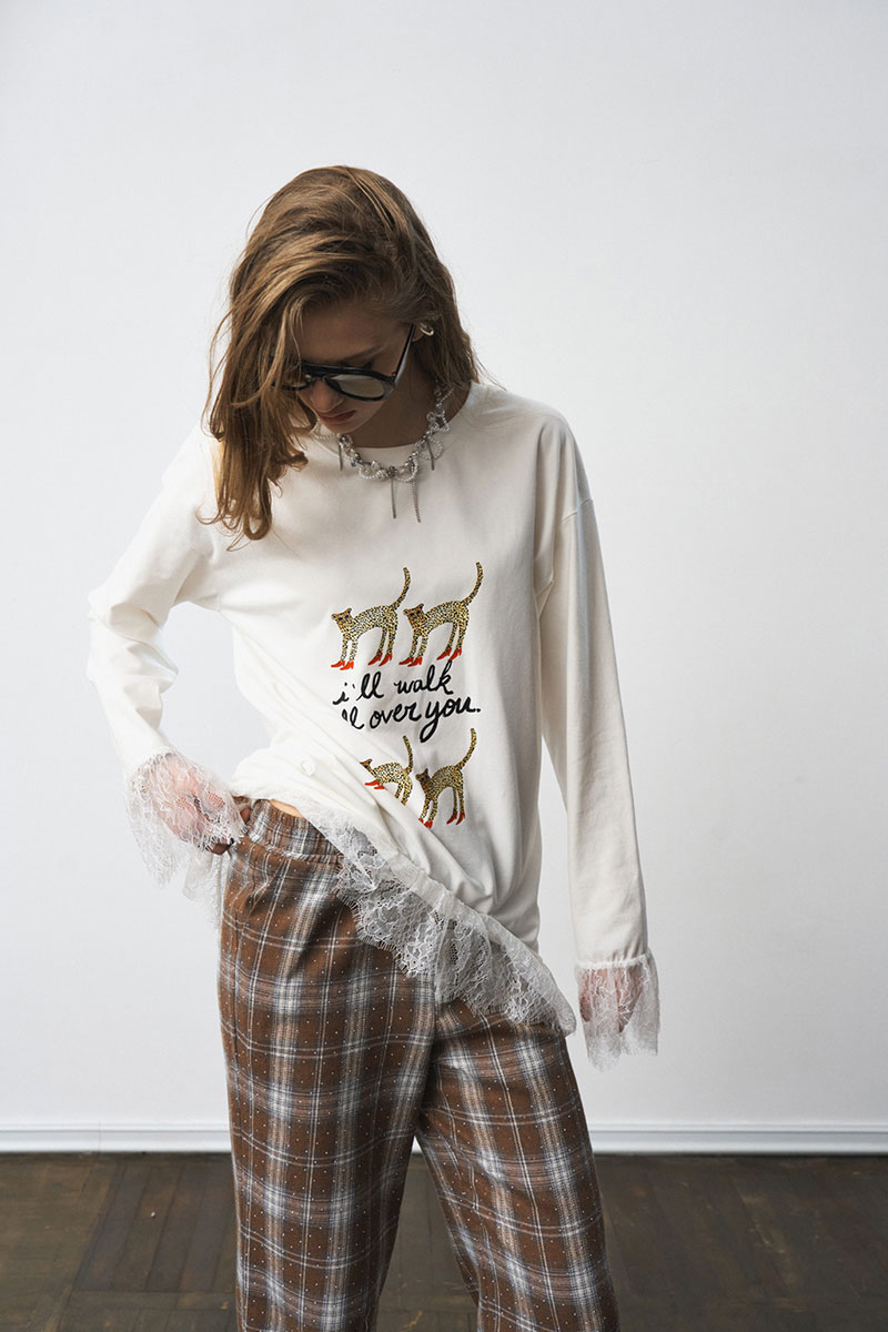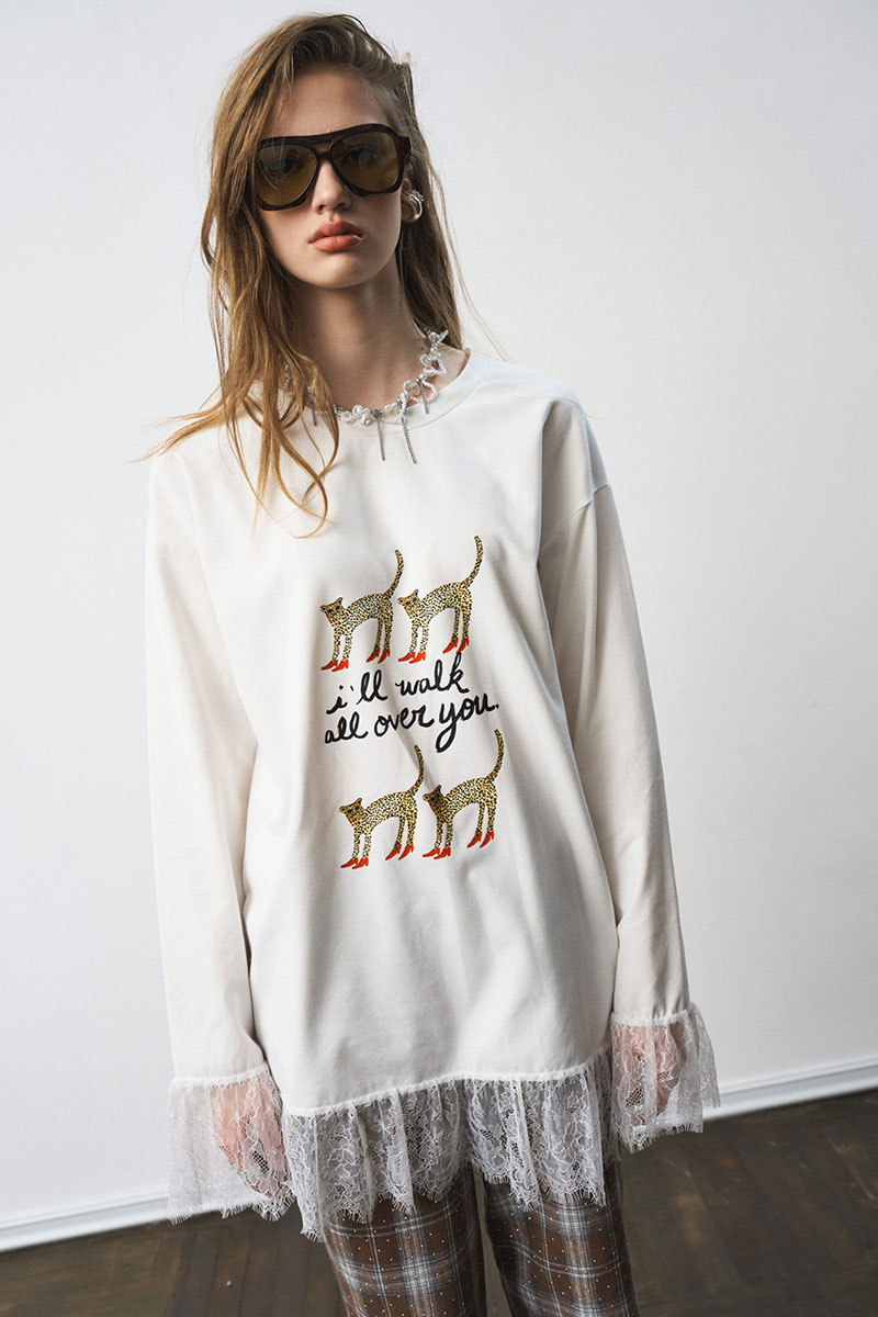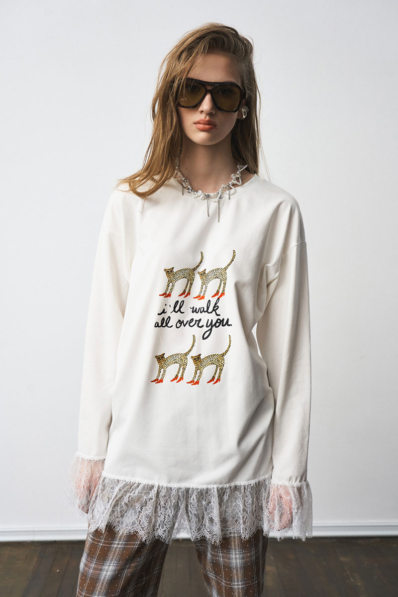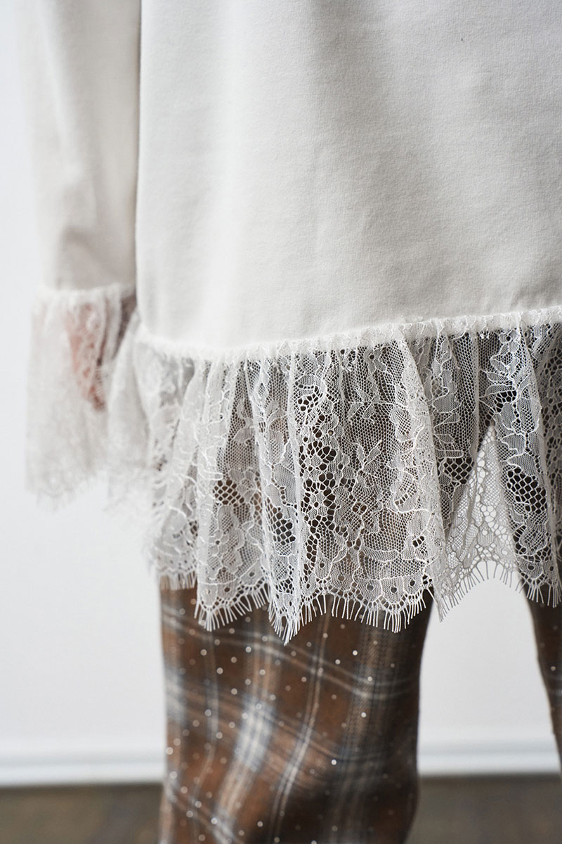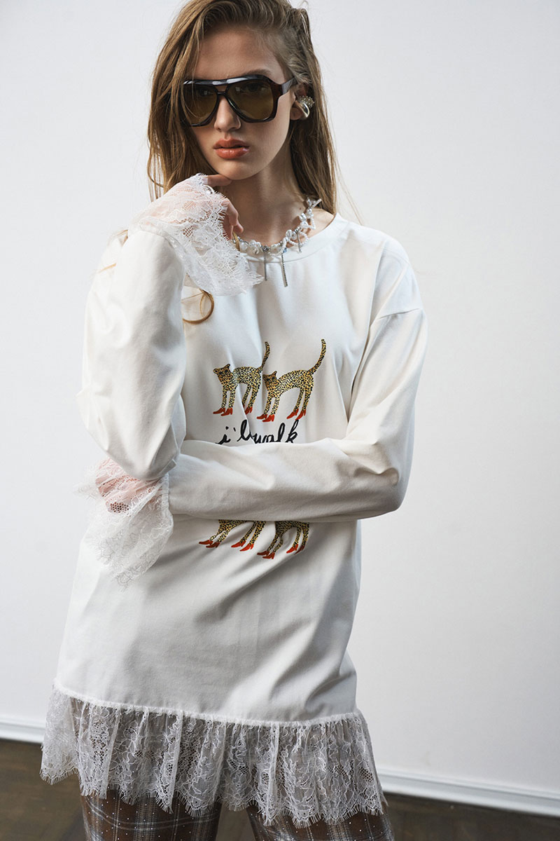 Лонгслив свободного силуэта, с принтом. Французское кружево по низу изделия и рукавов.