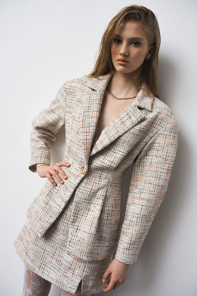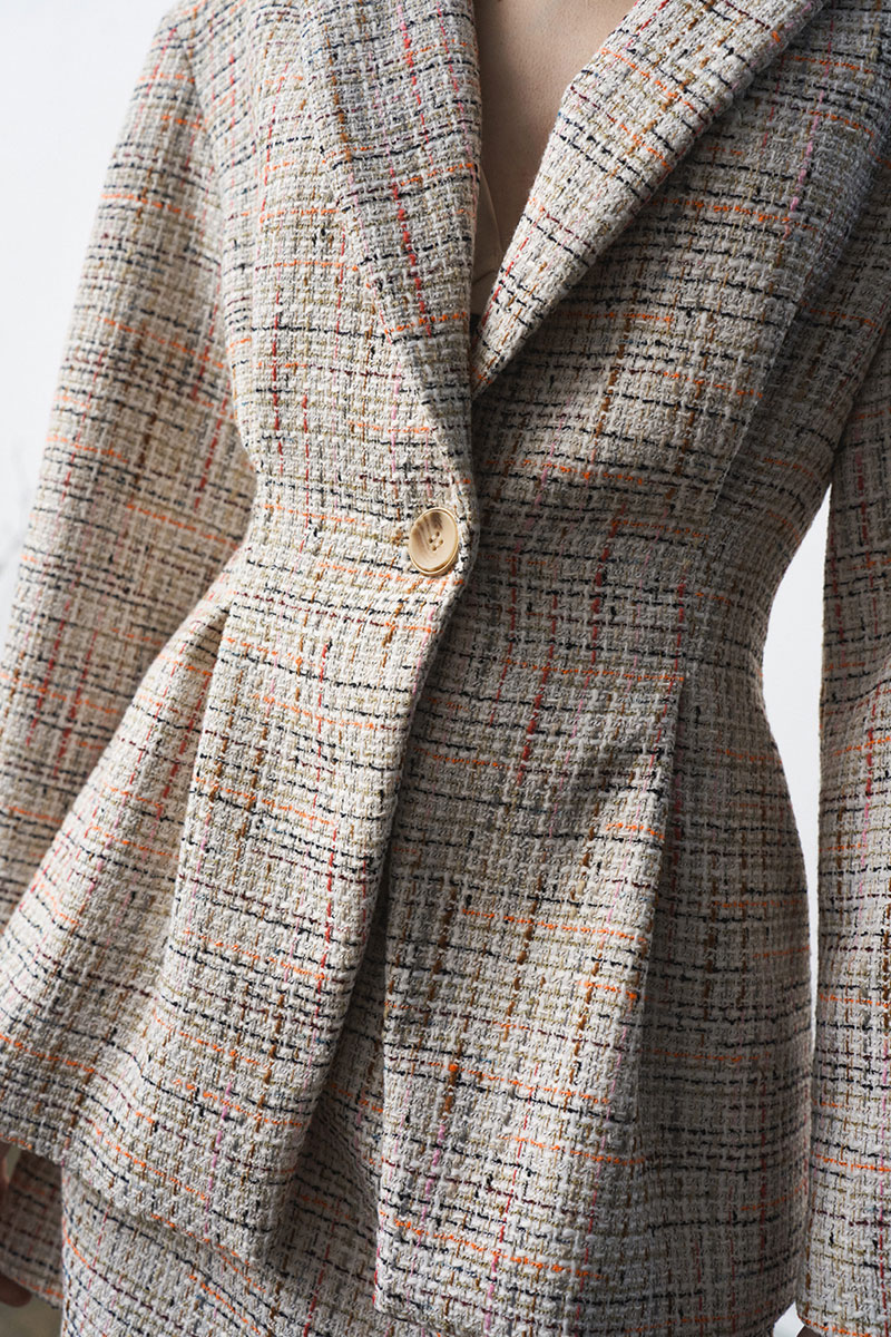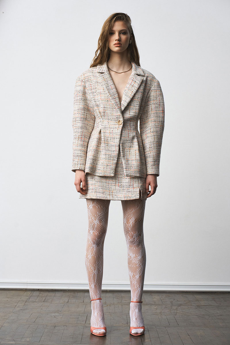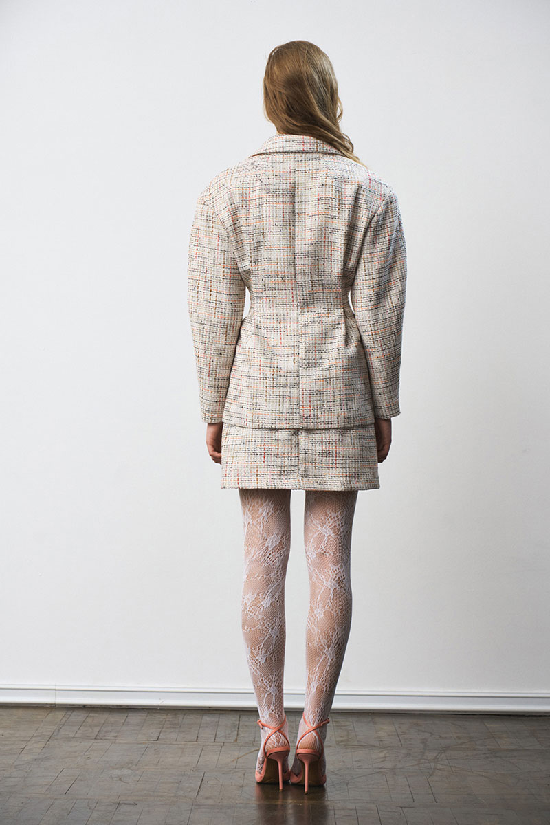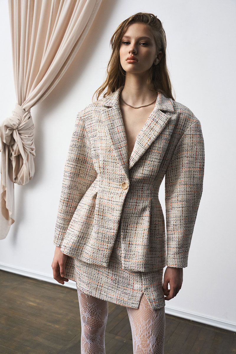 Костюм из рогожки, на подкладке. Жакет - прилегающего силуэта со складками по талии и рукавами О-силуэта. Мини-юбка на подкладке с застежкой-молнией сзади; разрез по переду.