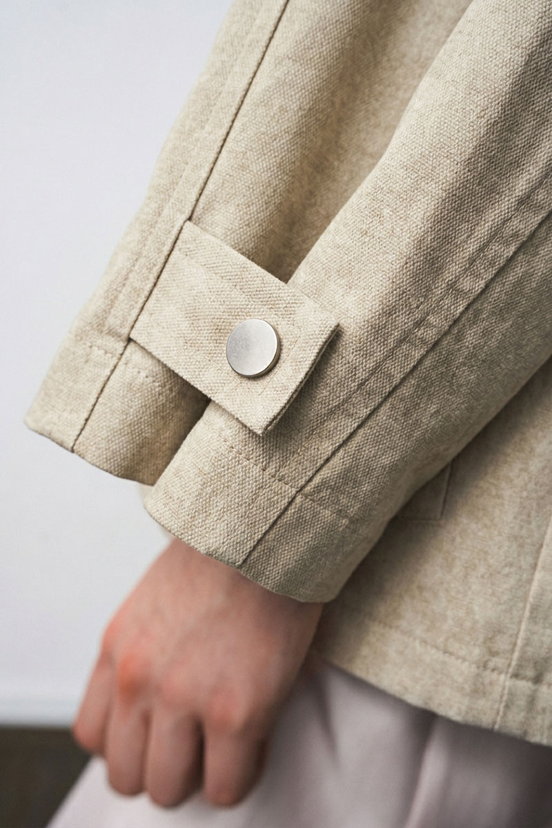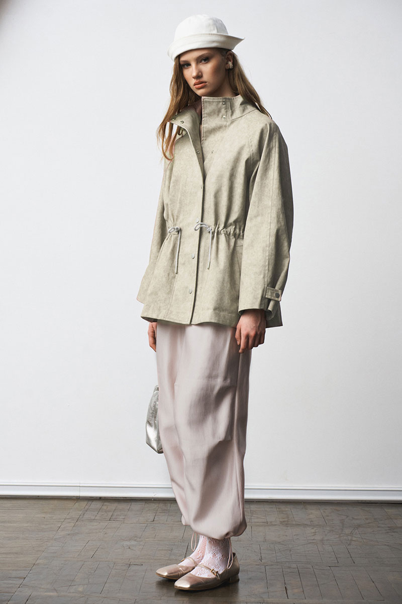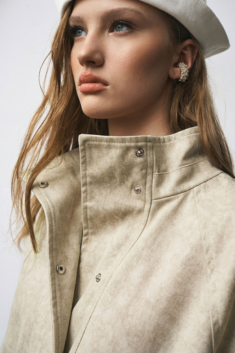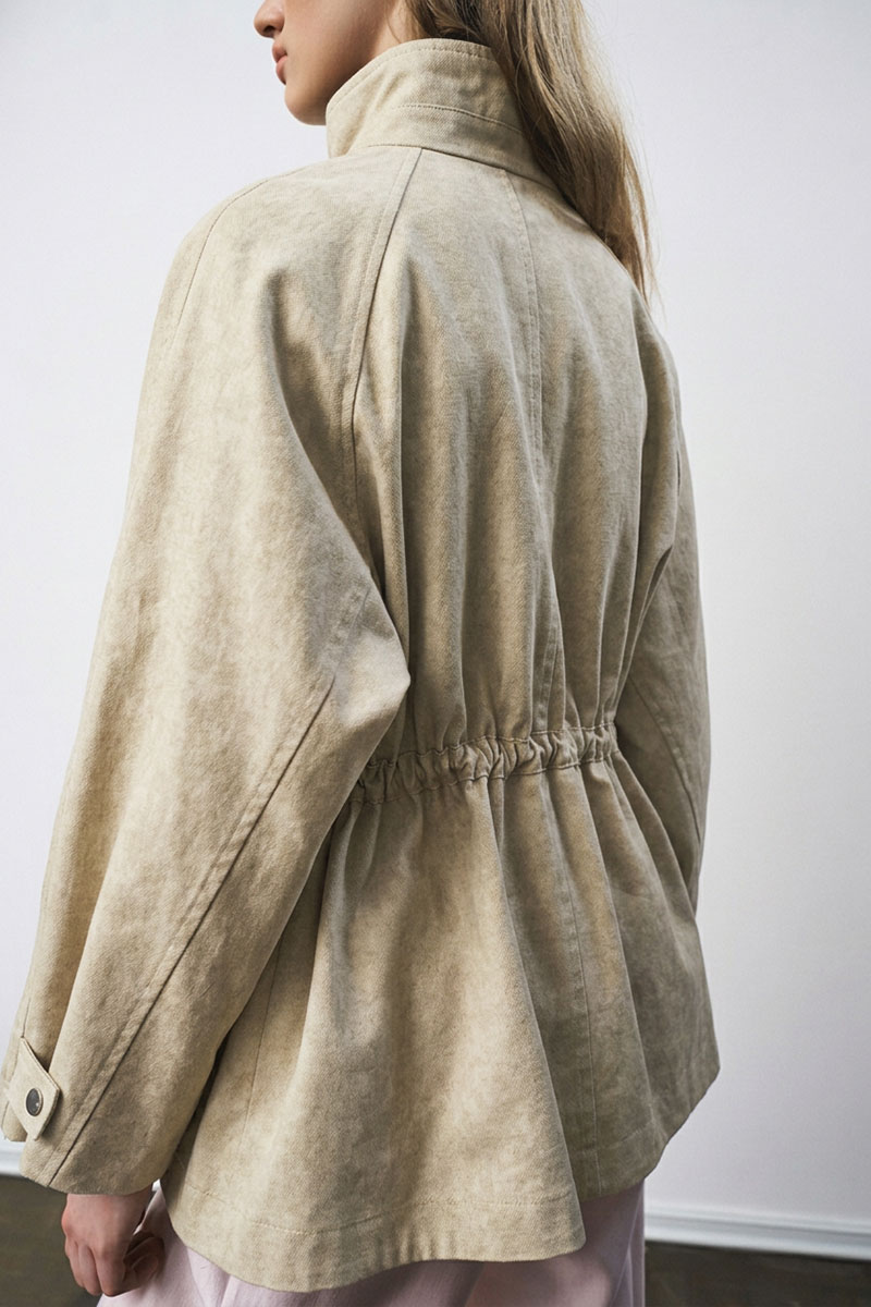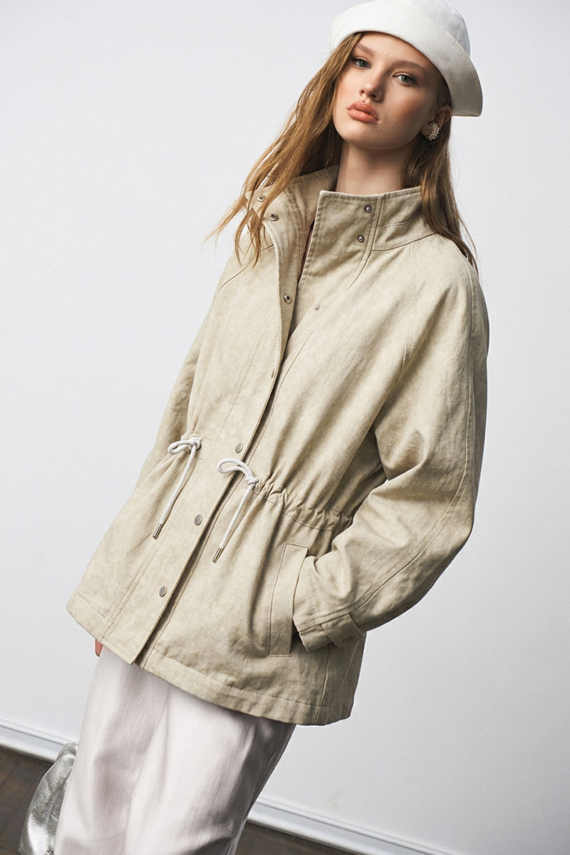 Жакет-парка из фактурного джинса с эффектом замши. Воротник-стойка. Широкий рукав, ширина которого регулируется кнопками. Свободный силуэт, ширина талии регулируется кулиской.