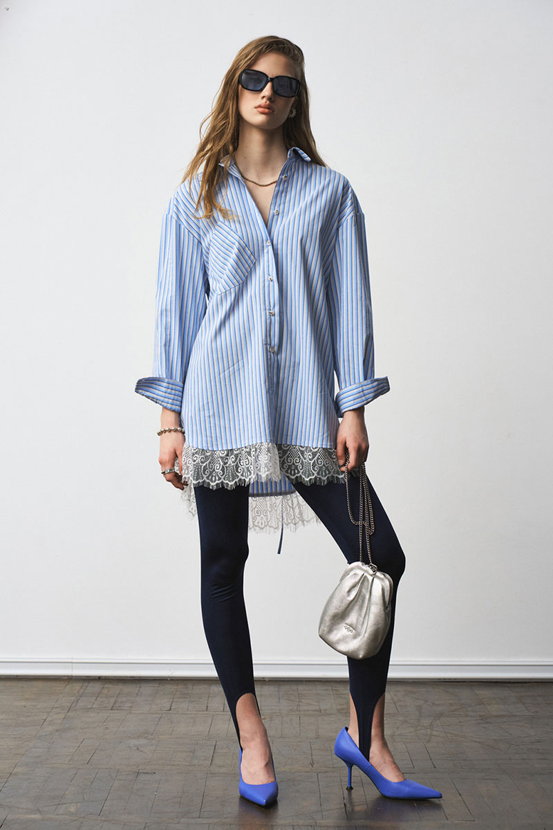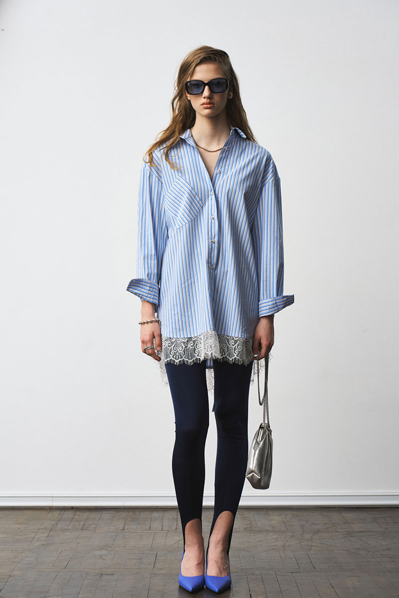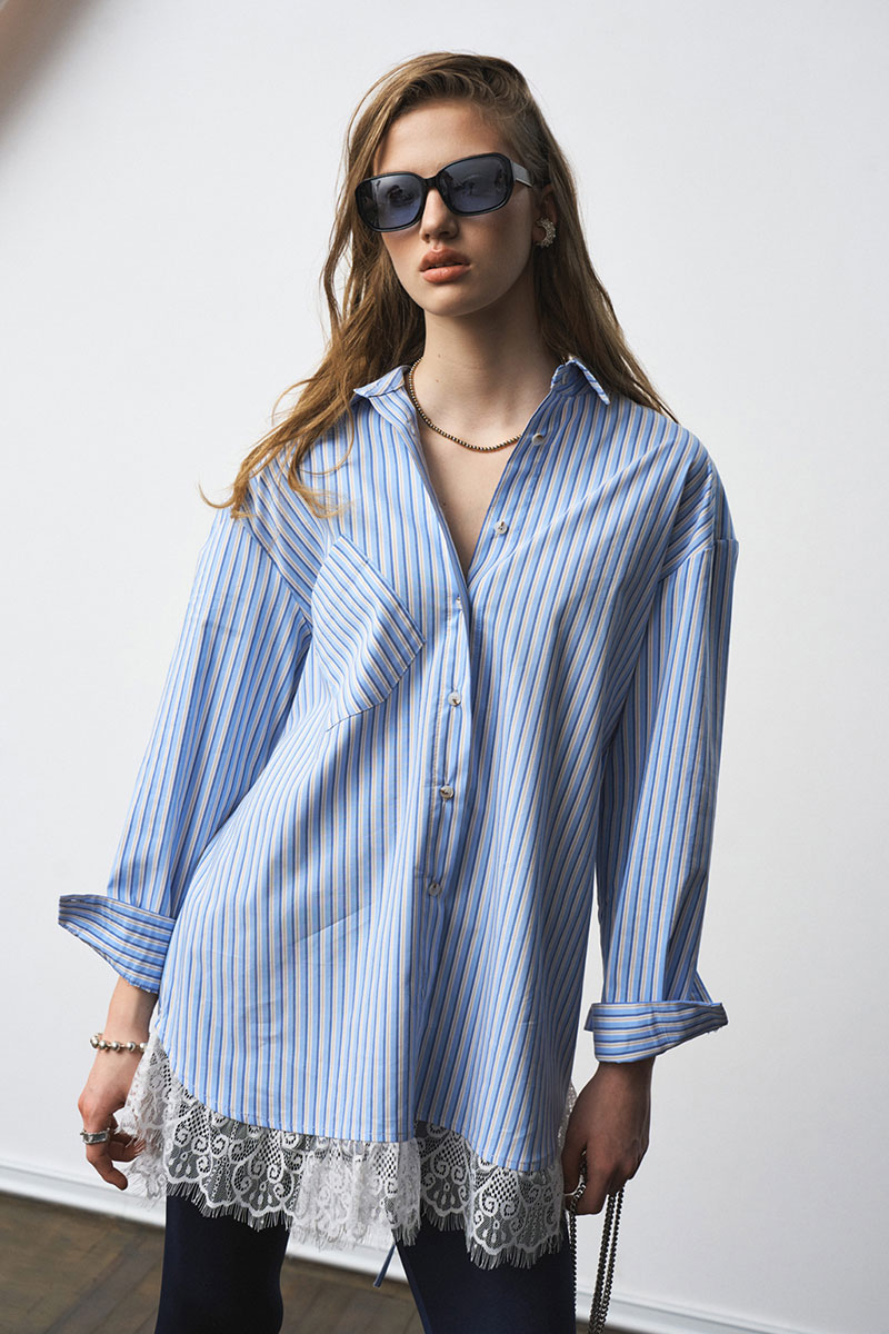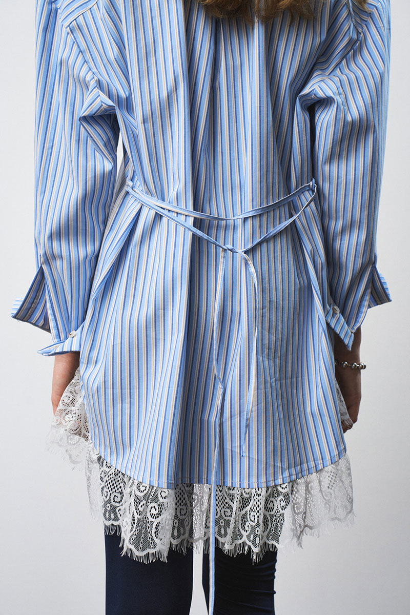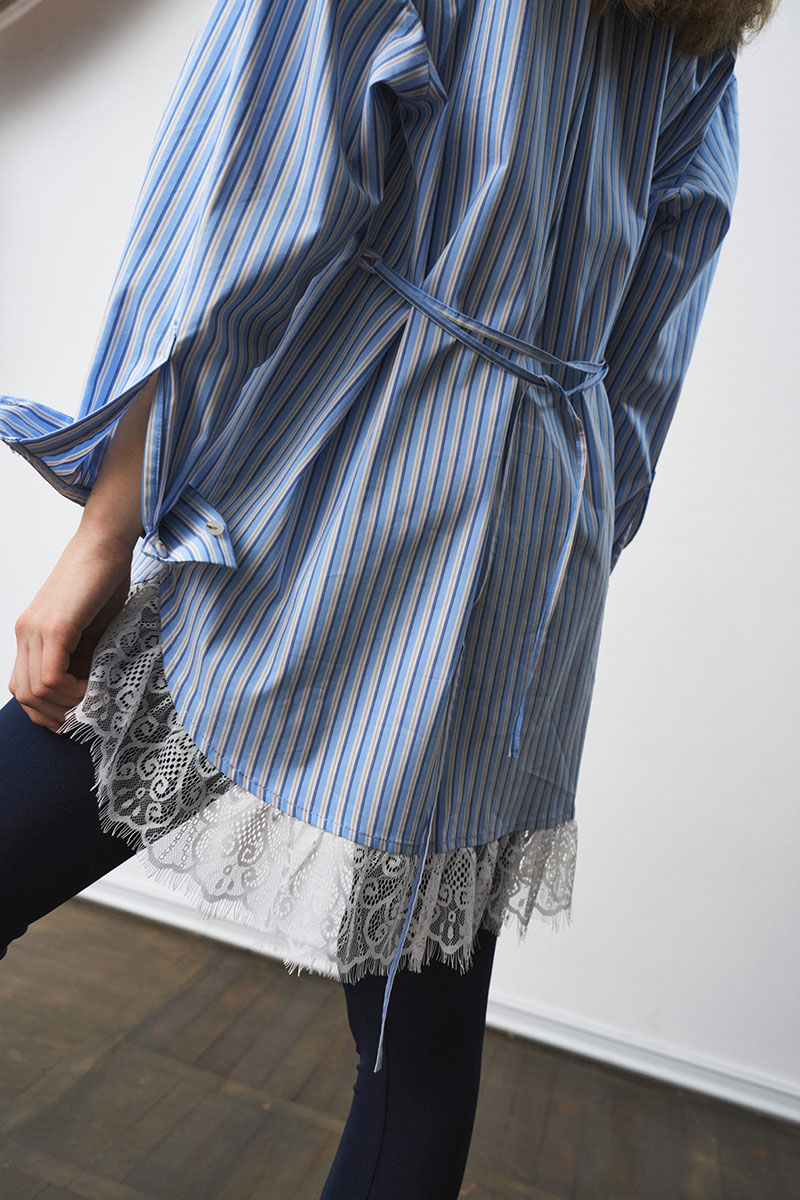 Рубашка прямого силуэта с французским кружевом по низу. Сзади - завязка дл ярегулировки ширины талии.