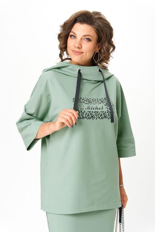 Джемпер свободного прилегания с цельнокроеным коротким рукавом, имеет объёмный воротник капюшон, с декоративной лентой, также по переду украшен эффектным принтом.