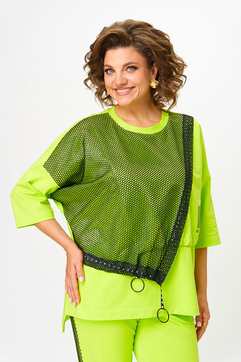 Джемпер свободного кроя, плечо приспущено, рукав ¾, украшен принтом в виде «штрихкода». Перед короче относительно спинки, по бокам разрезы, украшением служат отлетные детали со стяжками на крупных кольцах по низу. Сложный крой и функциональность костюма делает его особенным и самостоятельным.