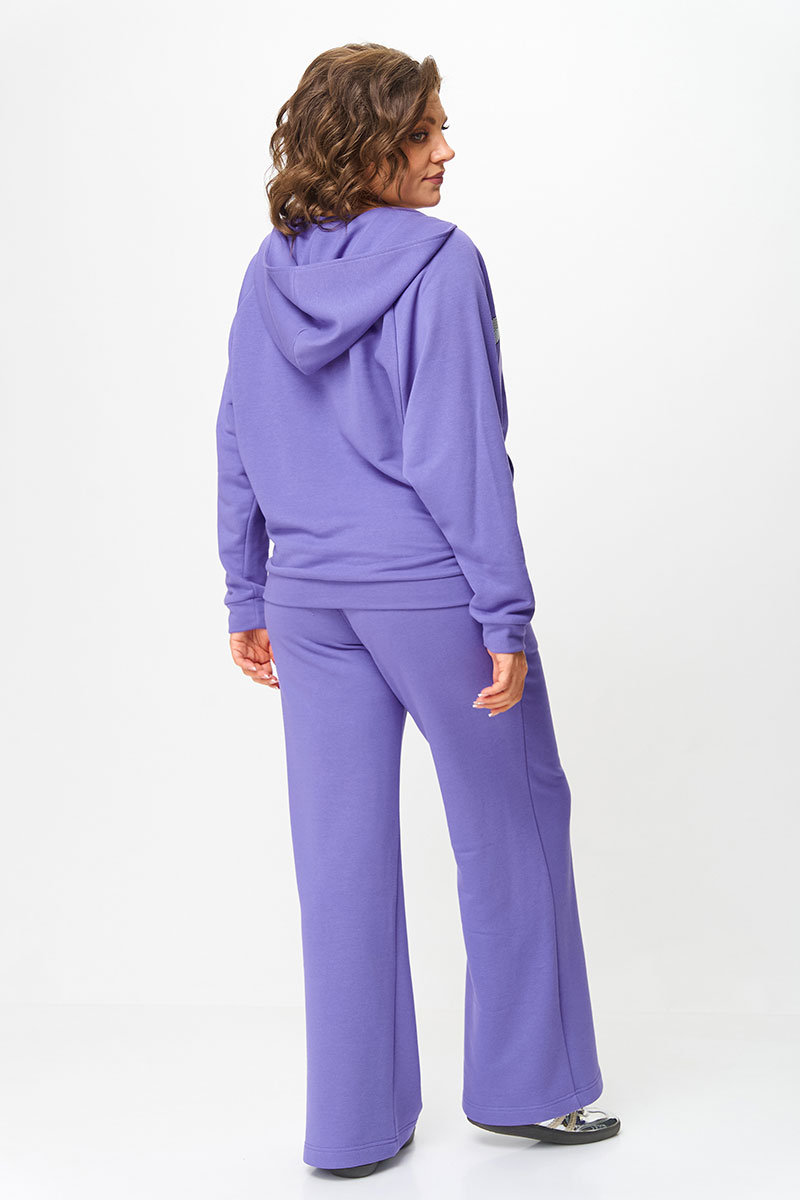 Худи с капюшоном выполнено по реглан-проходу, с длинными рукавами на манжете, что обеспечивает свободу движений и уют. Передняя часть украшена центральной молнией и вместительным карманом-кенгуру, а спинка — цельная. Низ худи дополнен притачной планкой для аккуратного силуэта. Внутренняя часть капюшона выполнена из контрастной ткани, добавляя изюминку образу. Костюм выполнен на флисовой подложке, что обеспечивает повышенную теплоизоляцию и дополнительный комфорт в холодную погоду.