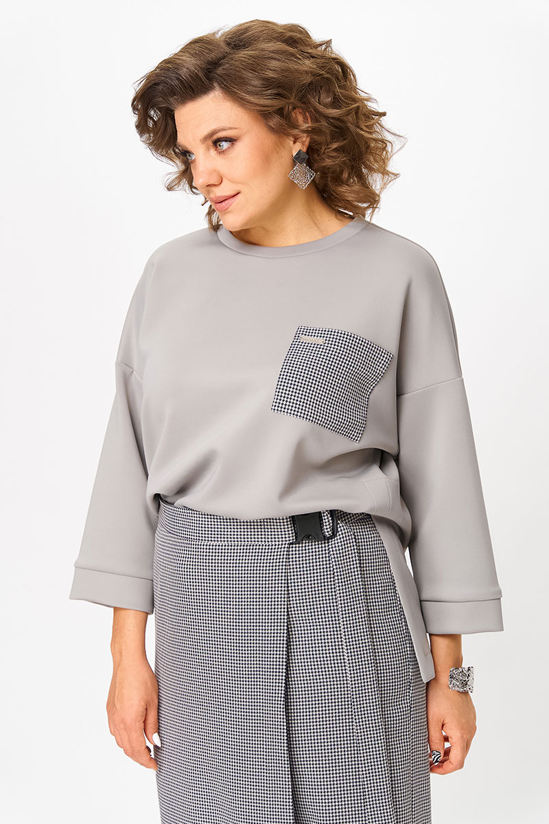 Джемпер имеет свободный крой с карманом на передней части, гармонирующим с цветом брюк, рукав спущен, по бокам разрезы, благодаря чему его с легкостью можно носить как навыпуск, так и заправленным.