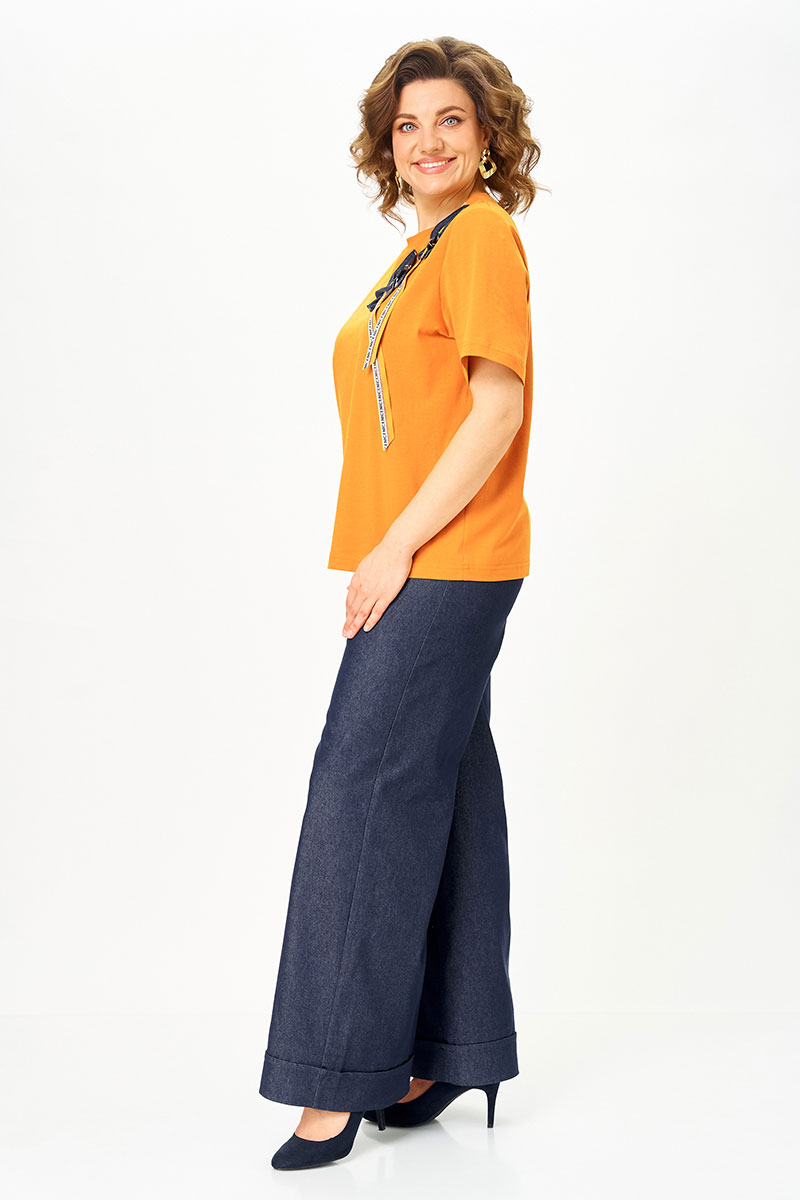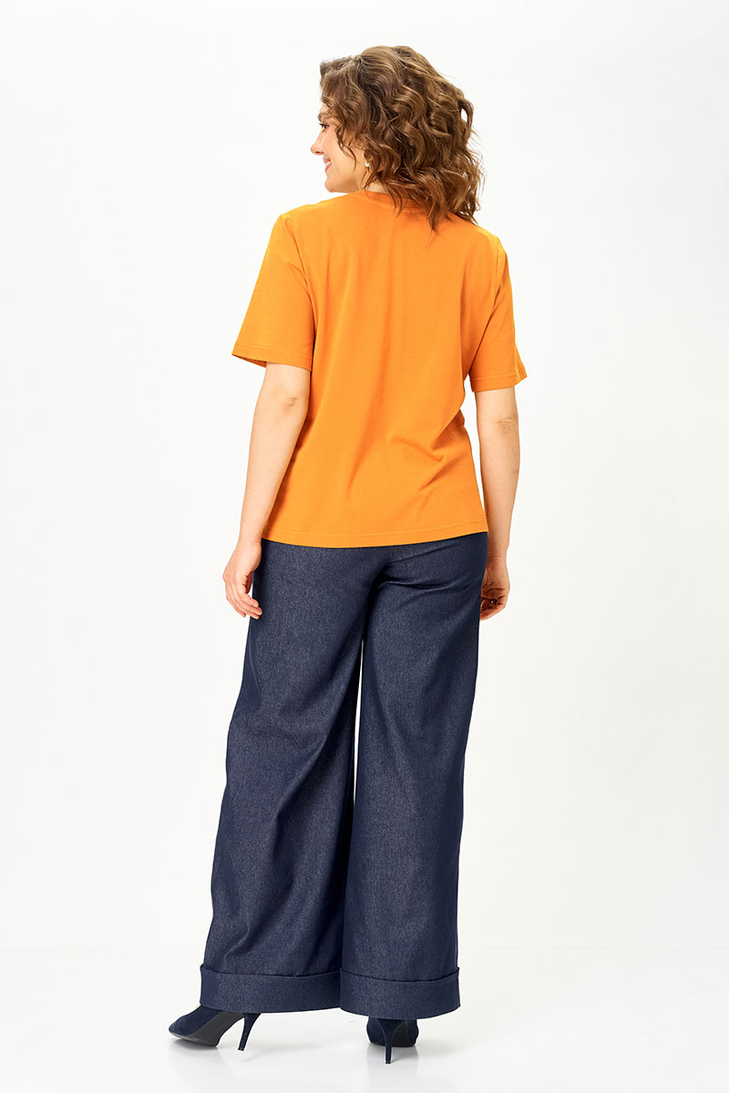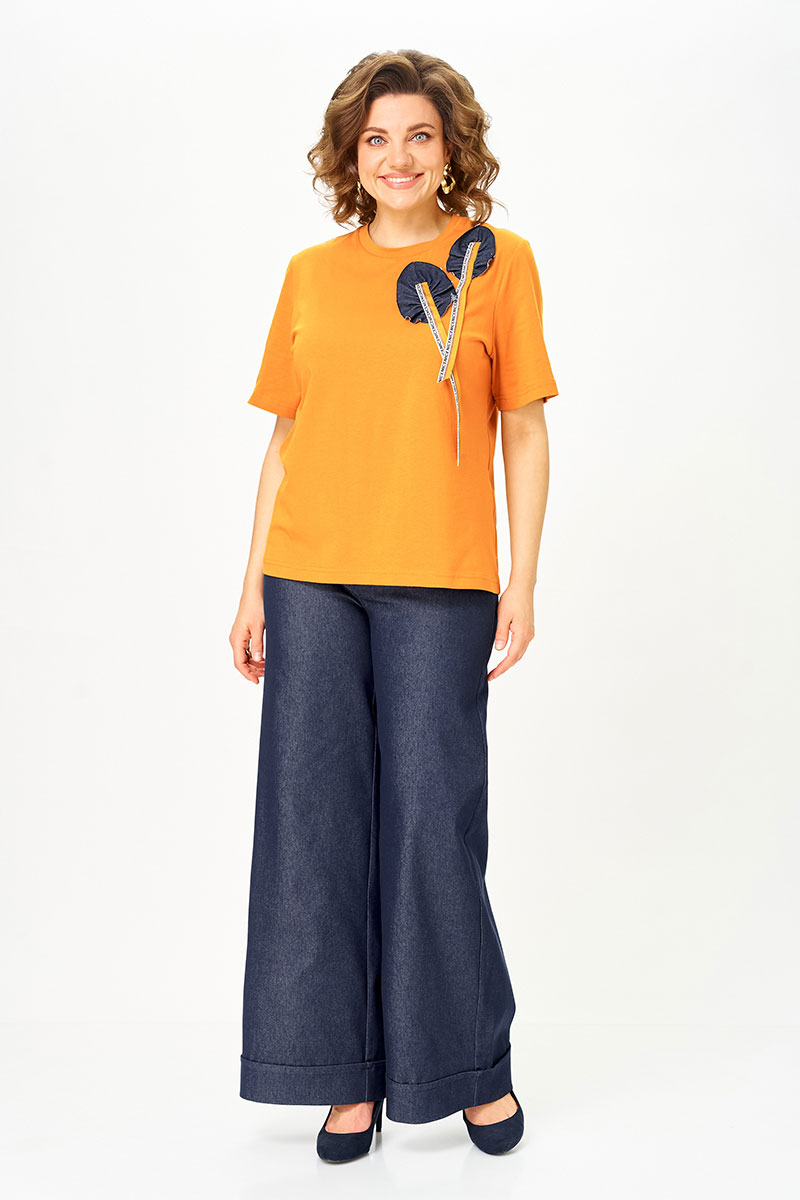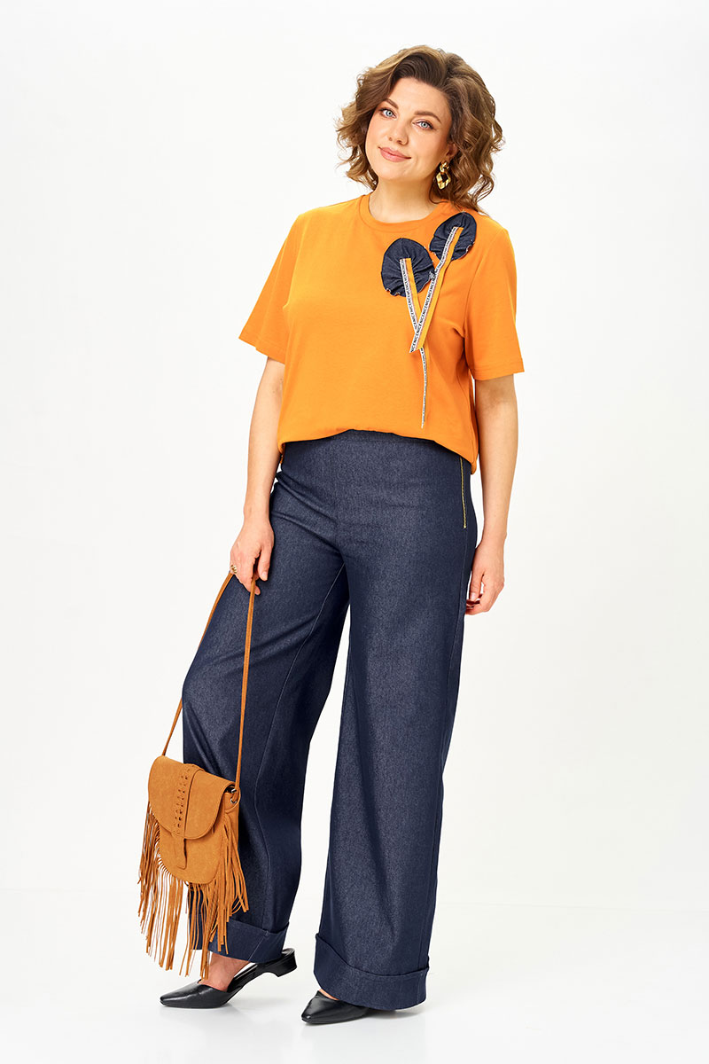 Футболка из хлопкового трикотажа — дышащая, приятная к телу и идеально подходит на каждый день. Декор из денима перекликается с брюками и собирает образ в единое стильное