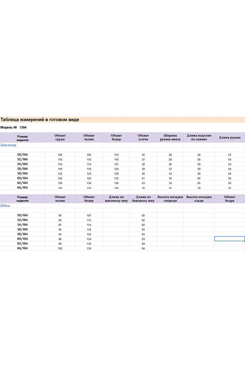 - Состав: джемпер: вискоза 80%; ПЭ 20%; юбка: ПЭ 96%; спандекс 4%