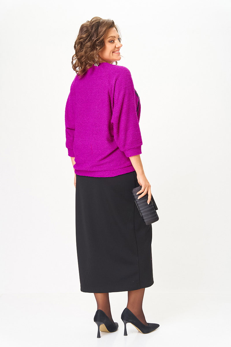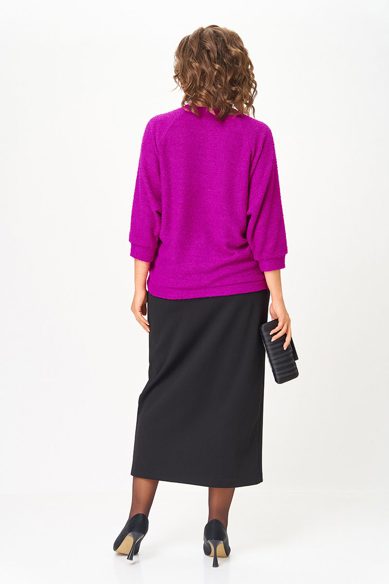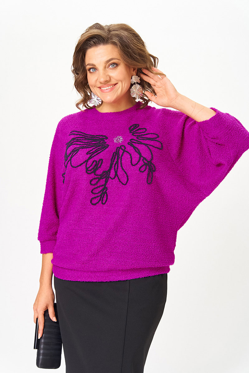 Джемпер выполнен из плотного трикотажа, с круглой горловиной и рукавами реглан «летучая мышь». Перед украшен изящной вышивкой, что придает изделию нарядный вид. Манжеты на рукавах и по низу выполнены из основной ткани.