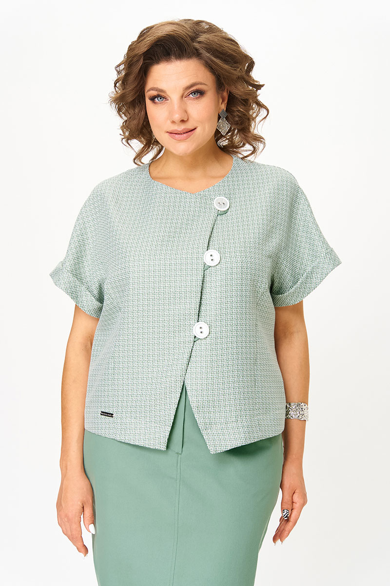Жакет укороченный, по переду с ассиметричным запахом и застежкой на подвесные петли с пуговицами.