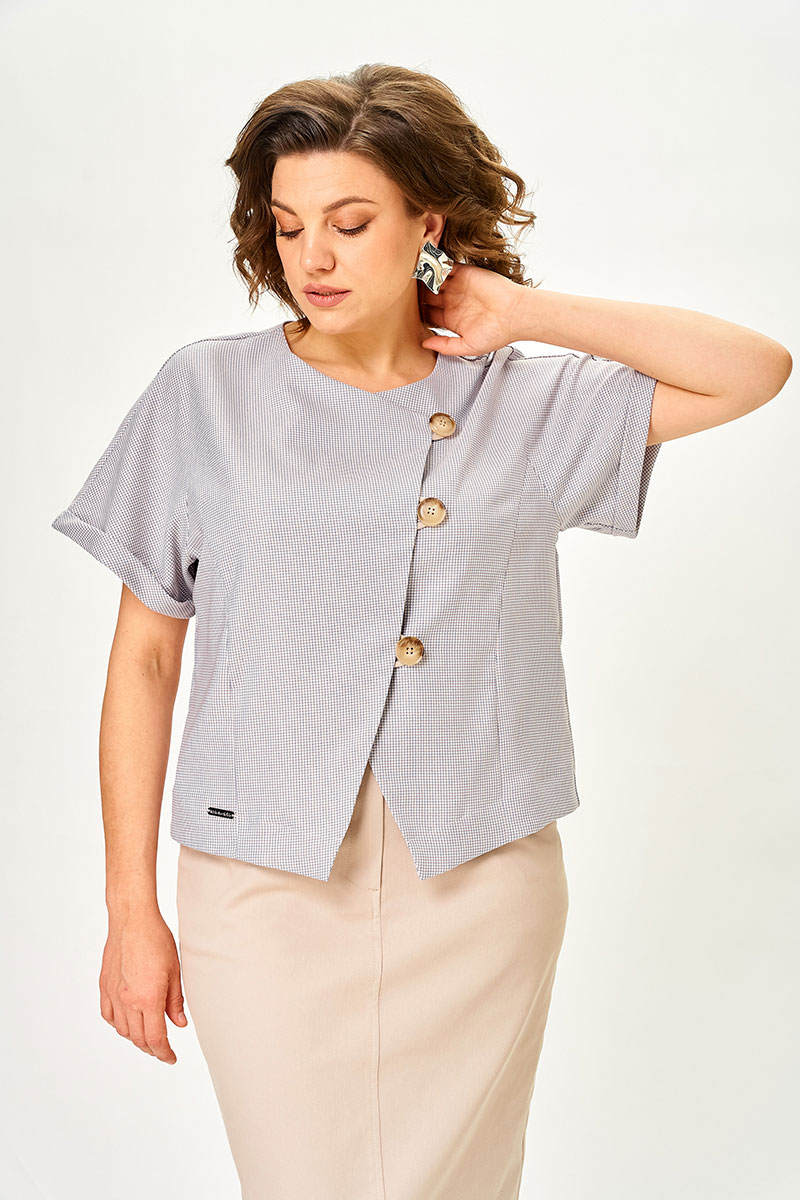 Жакет выполнен из ткани с мелким рисунком «гусиная лапка» в актуальном оттенке — он освежает образ и делает его более статусным. Свободный крой и мягкая линия плеча обеспечивают