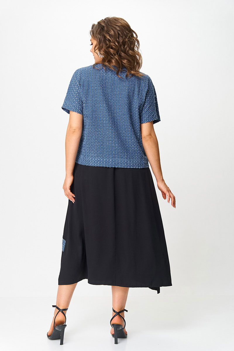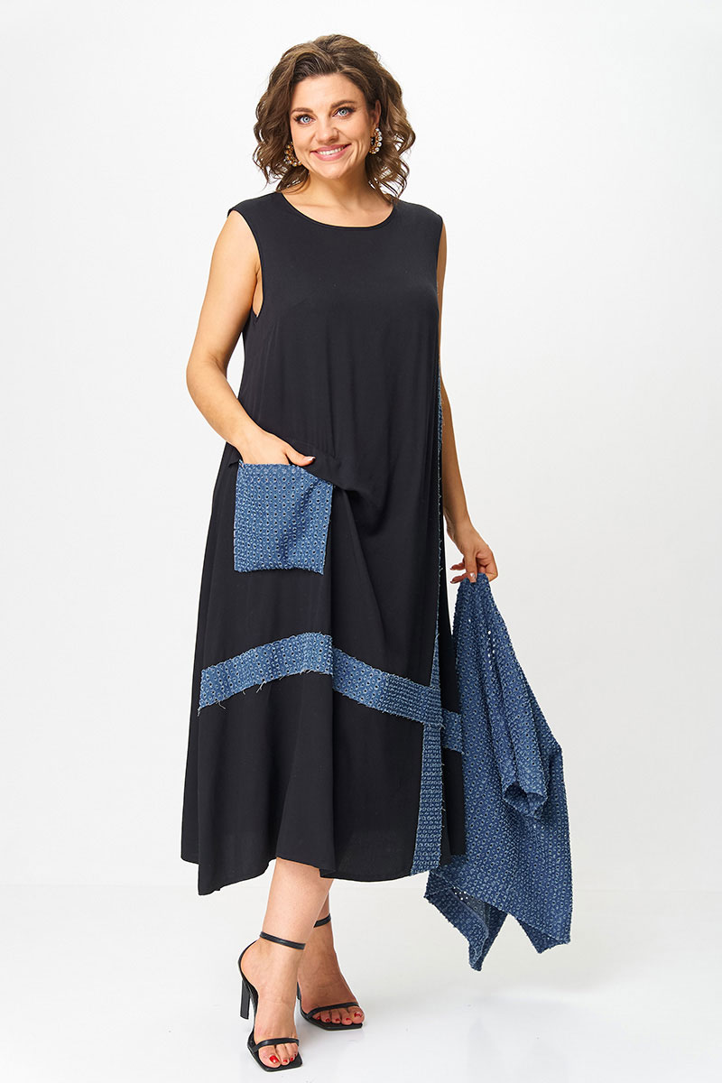 Платье с круглой горловиной декорировано накладным джинсовым карманом и складкой ,по низу платья два боковых разреза, карман в боковом шве.
