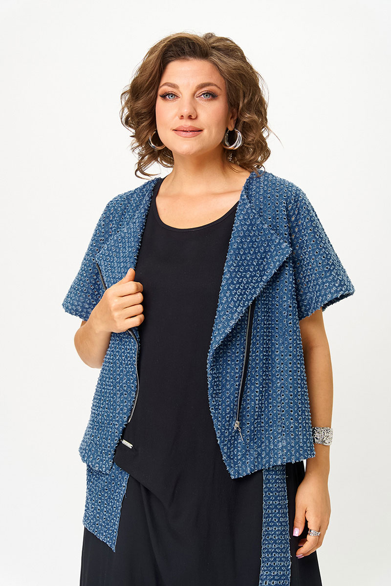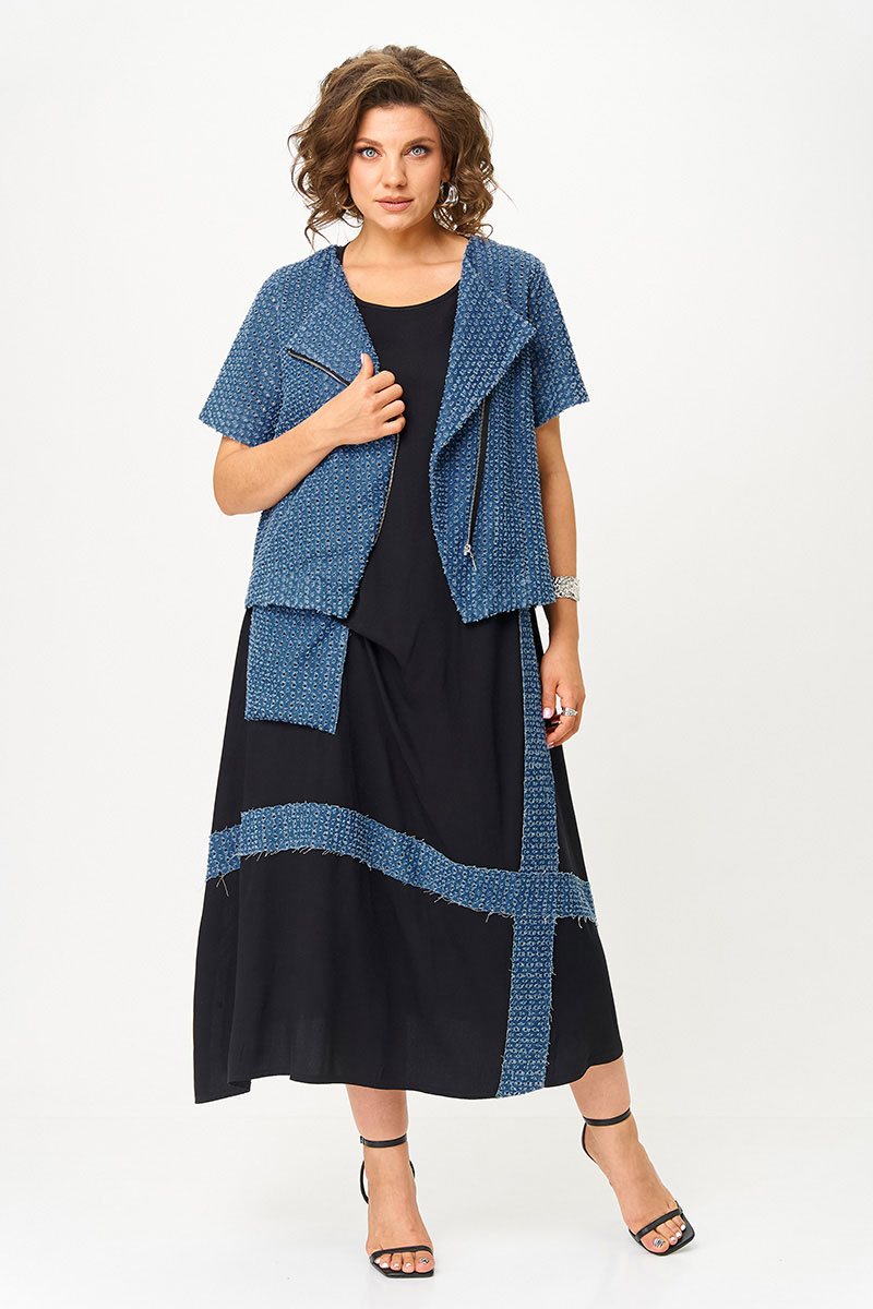 Такой наряд отлично подойдет для повседневной носки, а также для вечерней прогулки. Женский комплект — летнее платье в стиле бохо без рукава + жакет из перфорированного джинса, укороченный с коротким цельнокроеным рукавом и асимметричной застежкой на молнии с запахом.