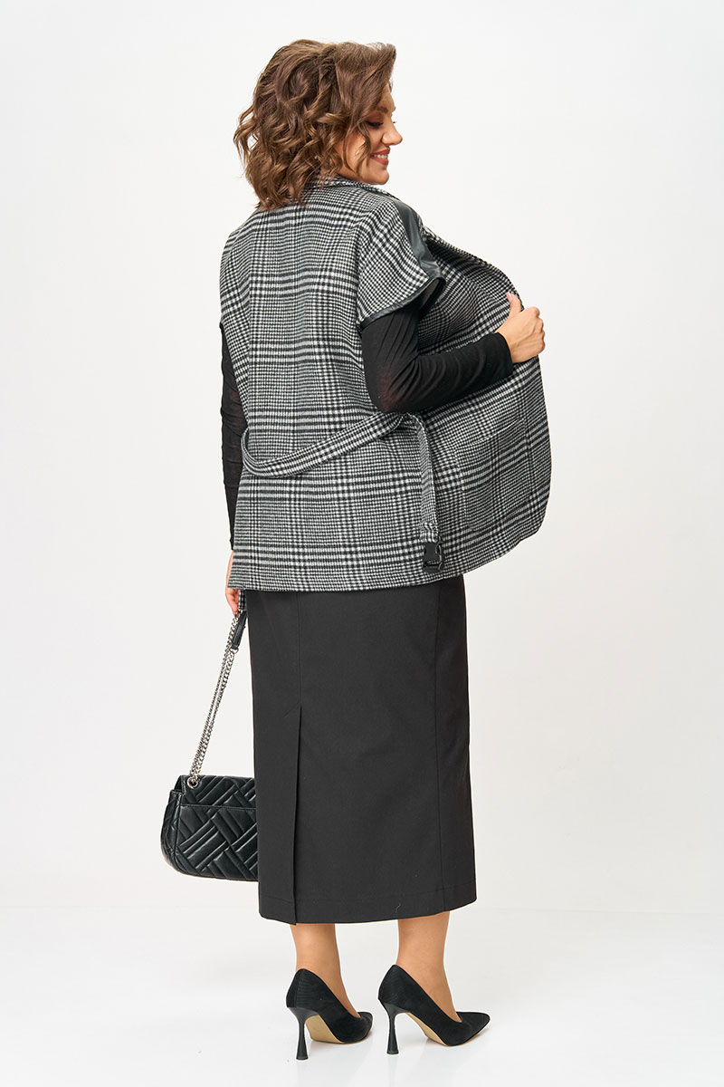 Этот комплект объединяет стильную клетку, трендовую джинсовую юбку и акцентные детали, оставаясь универсальным выбором для офиса, встреч и casual-образов.