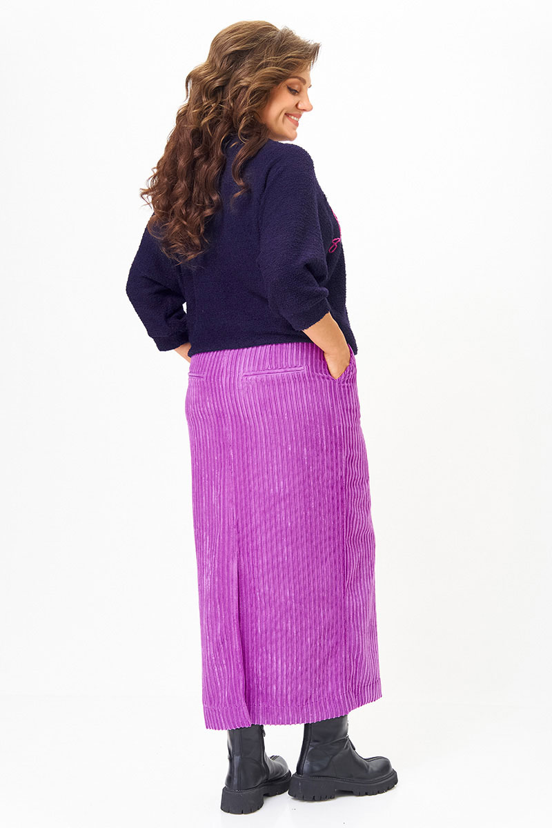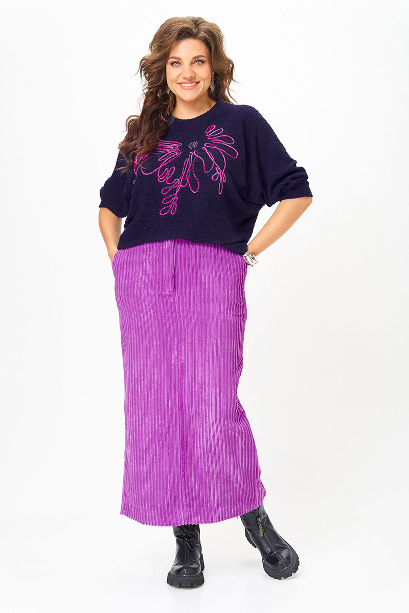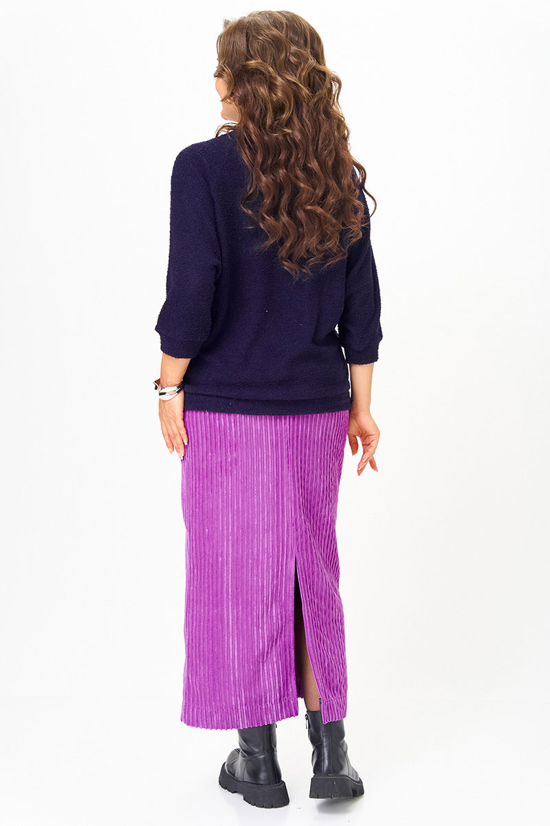 Этот элегантный и модный комплект станет ярким акцентом в вашем гардеробе! Комплект включает в себя яркий темно-синий джемпер с рукавами реглан «летучая мышь» и изящную юбку в пурпурных тонах, выполненную из мягкого, приятного к телу вельвета.