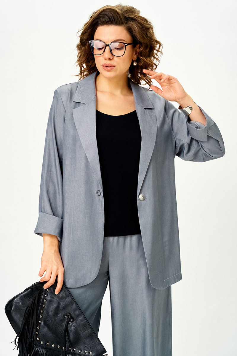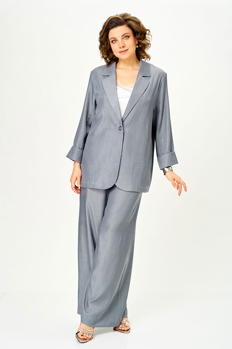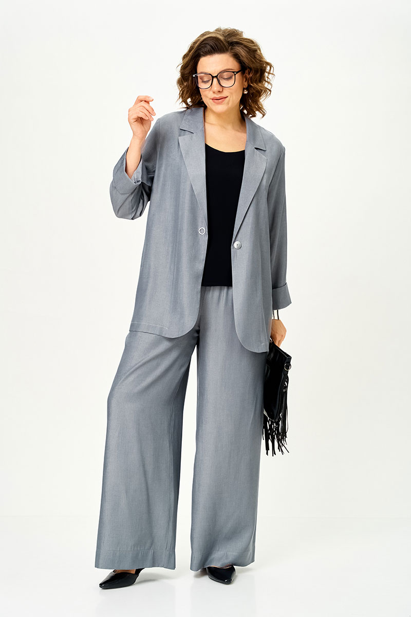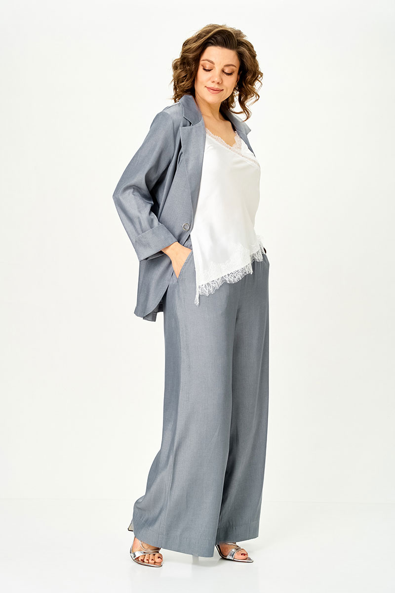 Современный женственный костюм из струящегося тонкого денима стального серого оттенка. Благородный цвет выглядит дорого и легко вписывается в гардероб, позволяя создавать как