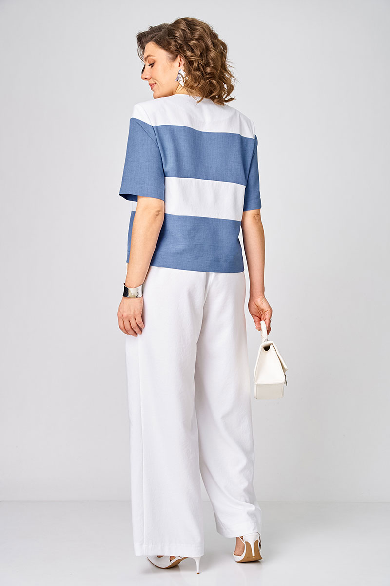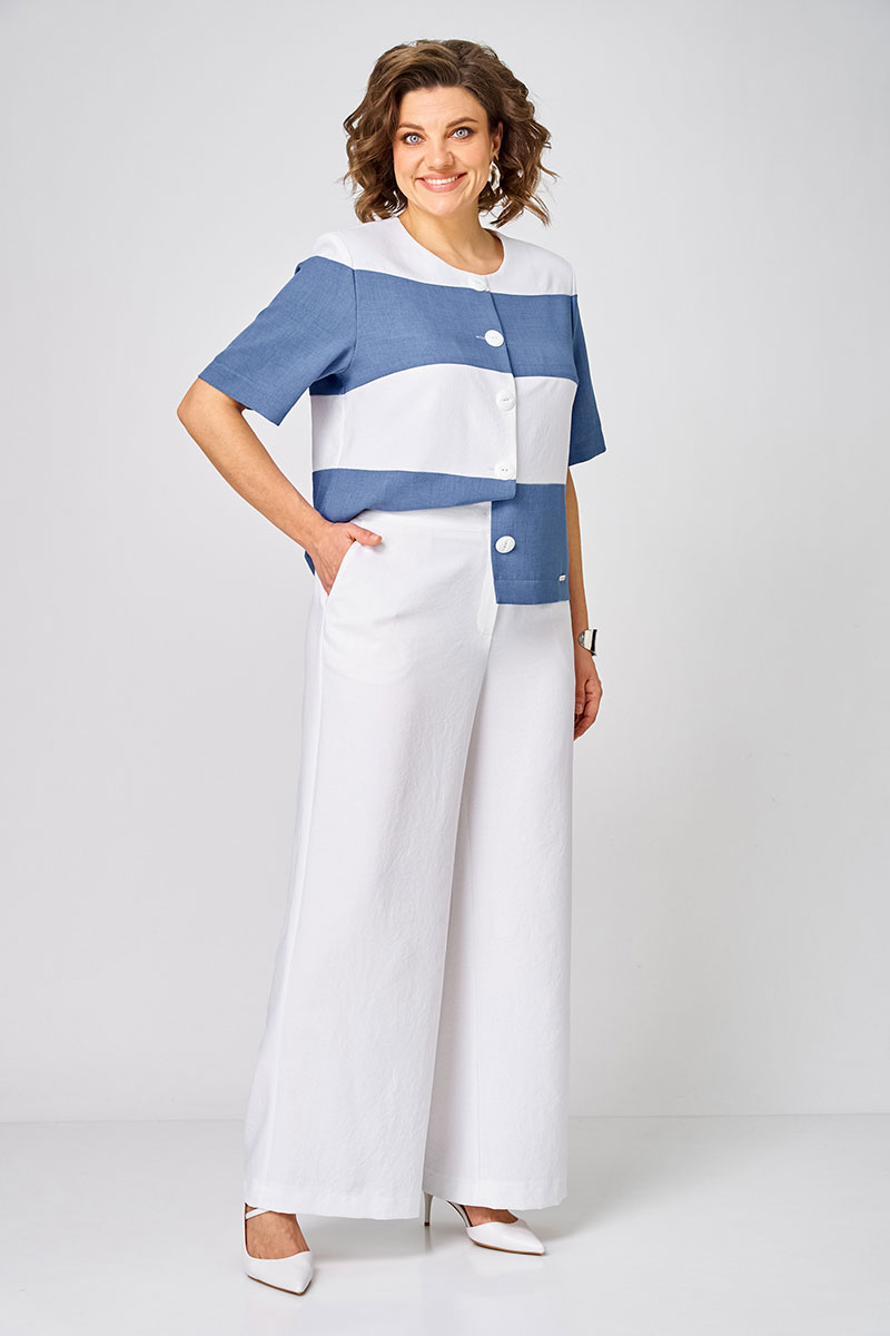 Жакет классического кроя на пуговицах можно носить соло (на топ/лиф) или вторым слоем — с сарафаном, блузой, майкой. Брюки-палаццо свободной посадки аккуратно выравнивают силуэт,