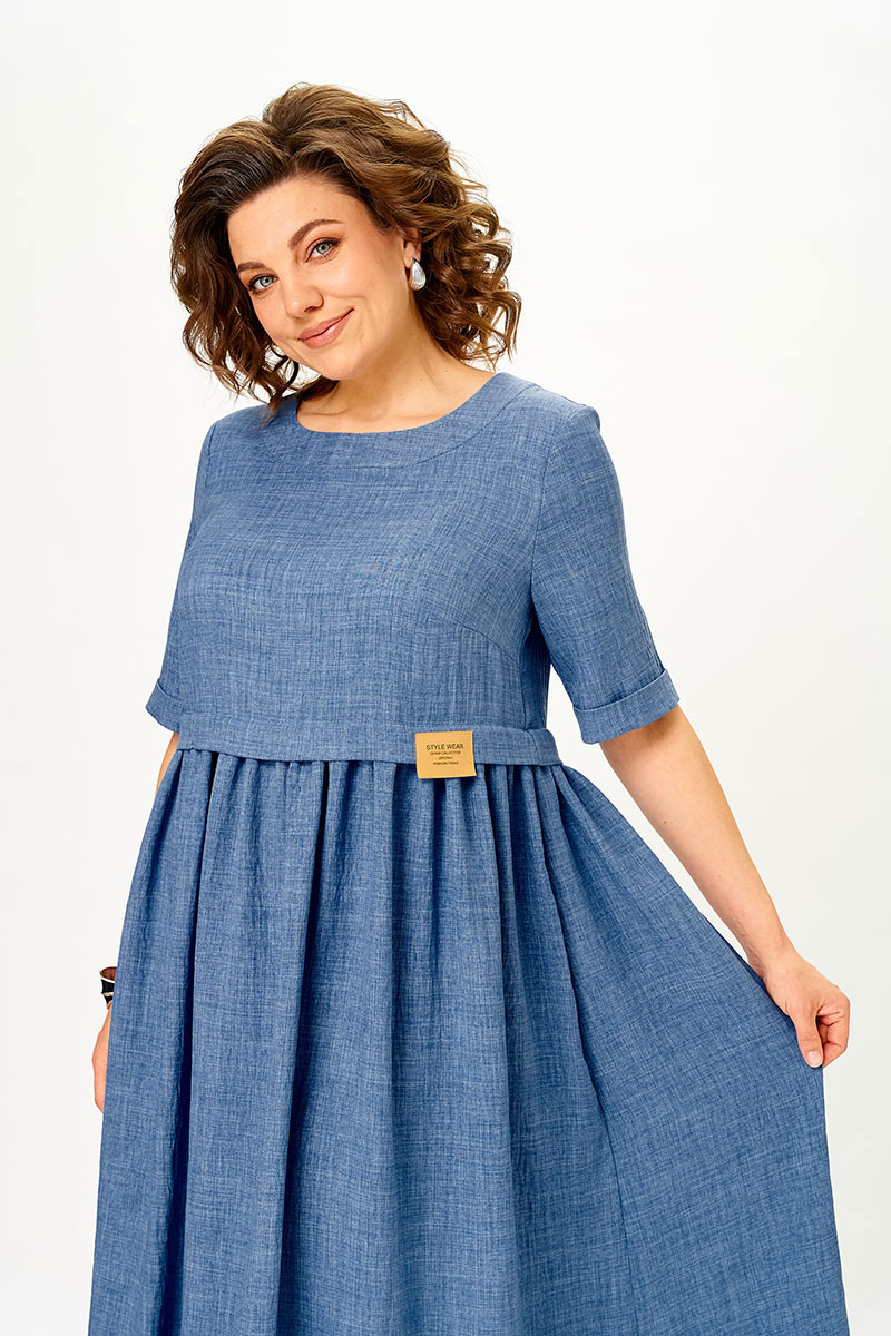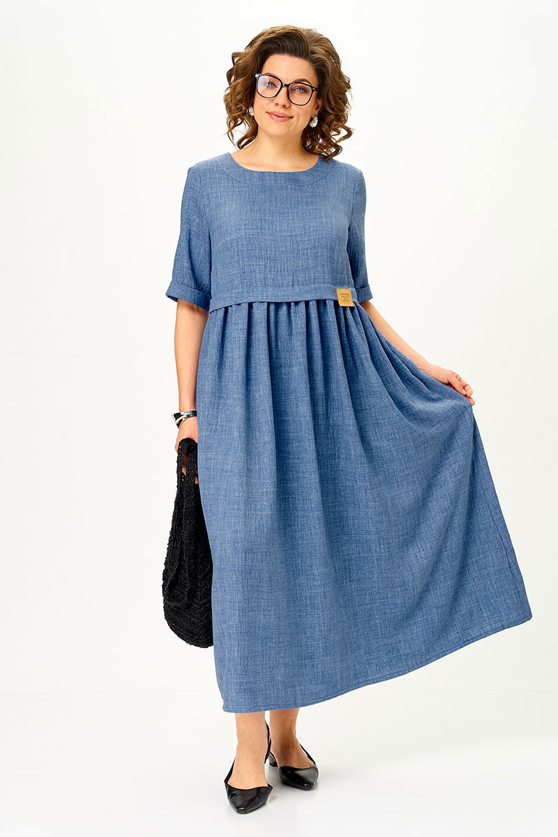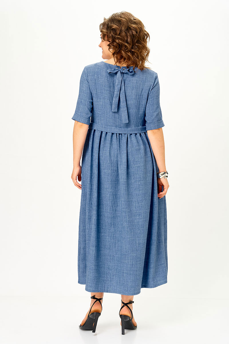 Платье имеет завышенную талию, округлую горловину, что делает его одновременно женственным и практичным. Уникальная деталь — завязка на спинке, которая подчеркивает изящность силуэта.
