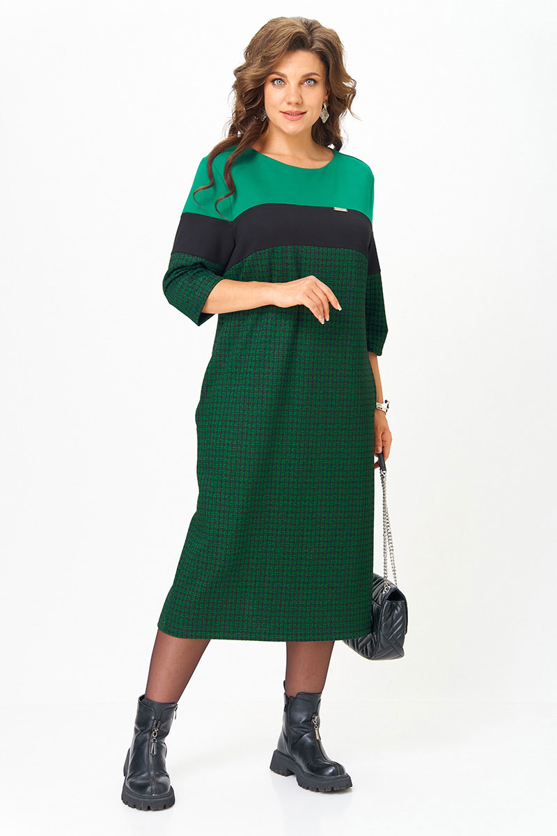 Контрастное сочетание оттенков — черно-зеленый принт, благородный чёрный и освежающий светло-зеленый у линии плеч — визуально делает образ ярче, моложе и эффектнее.