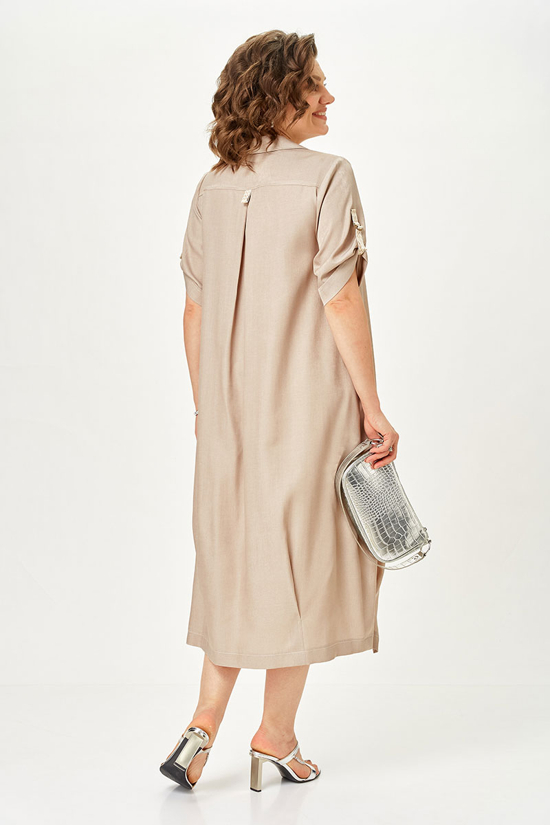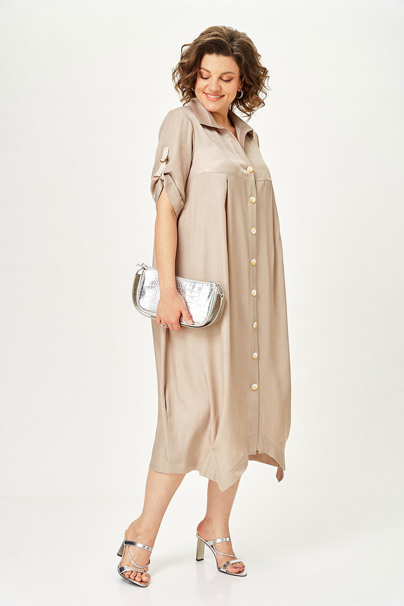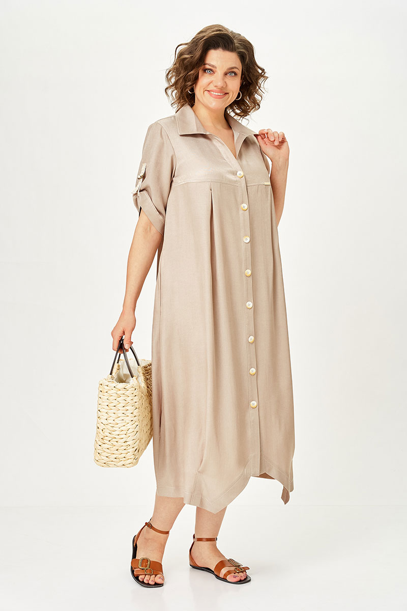 Это то самое платье-рубашка, которое собирает образ за минуту. Свободный крой мягко скрывает нюансы фигуры, не подчёркивая лишнего. Защипы по низу формируют аккуратный силуэт, а