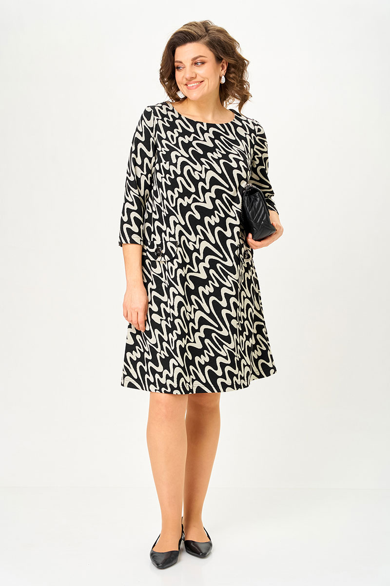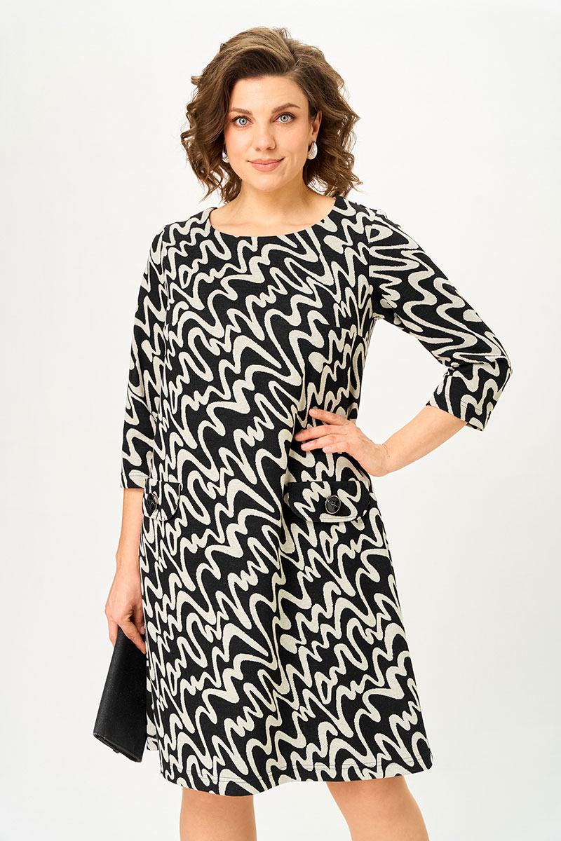 Свободный А-образный крой деликатно скрывает нюансы фигуры и красиво движется в шаге. Рукав 3/4 делает платье идеальным для переходного сезона, а декоративные клапаны «заземляют»