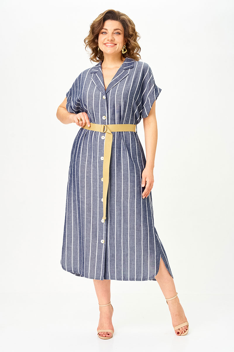 Ткань с добавлением льна дышит, не перегревает и комфортна даже в жару. Крупная вертикальная полоска визуально вытягивает силуэт и делает фигуру стройнее.