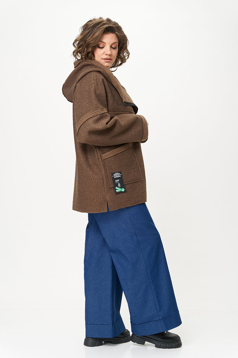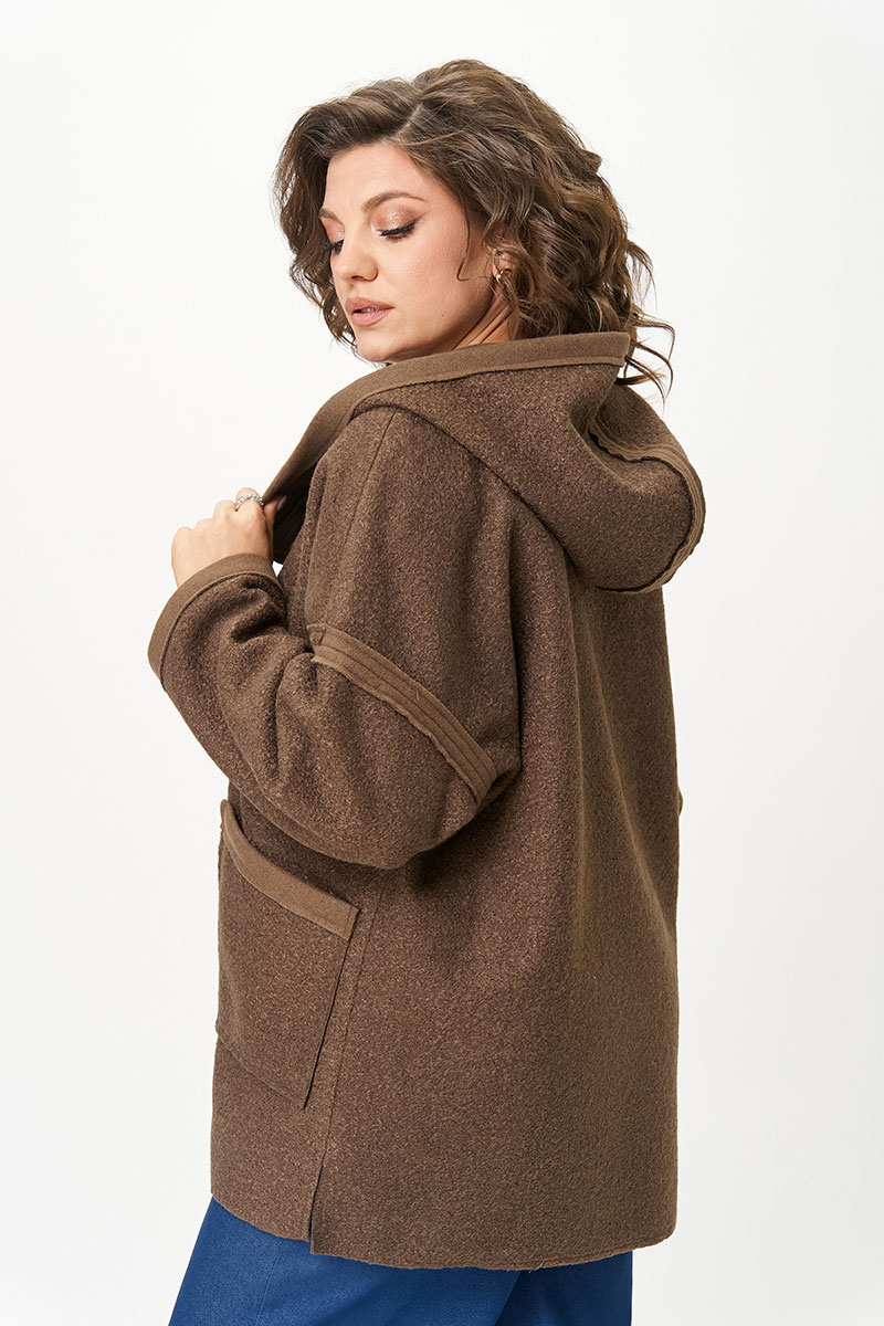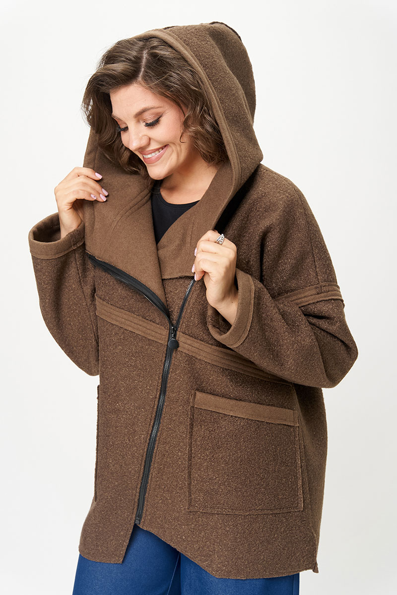 Женское полупальто для повседневной носки выполнено из пальтовой ткани средней плотности, без подкладки. Ткань с эффектом букле. Полупальто длиной до бедер свободного кроя с капюшоном. Плечо спущенное, рукав длинный втачной. Перед изделия с асимметричной косой застежкой на разъемную тесьму-молнию. Спинка прямая цельная. Полупальто украшено рельефными швами срезами наружу. По переду накладные карманы. Низ изделия разноуровневый с необработанным краем. Полупальто смело сочетается с любым низом (юбка, брюки, джинсы) и обувью.