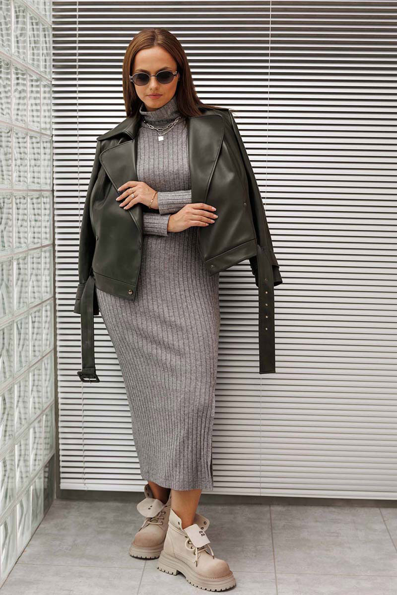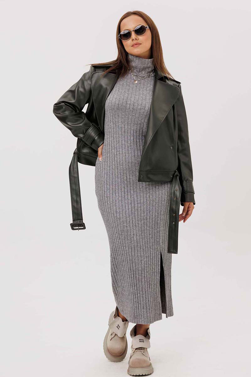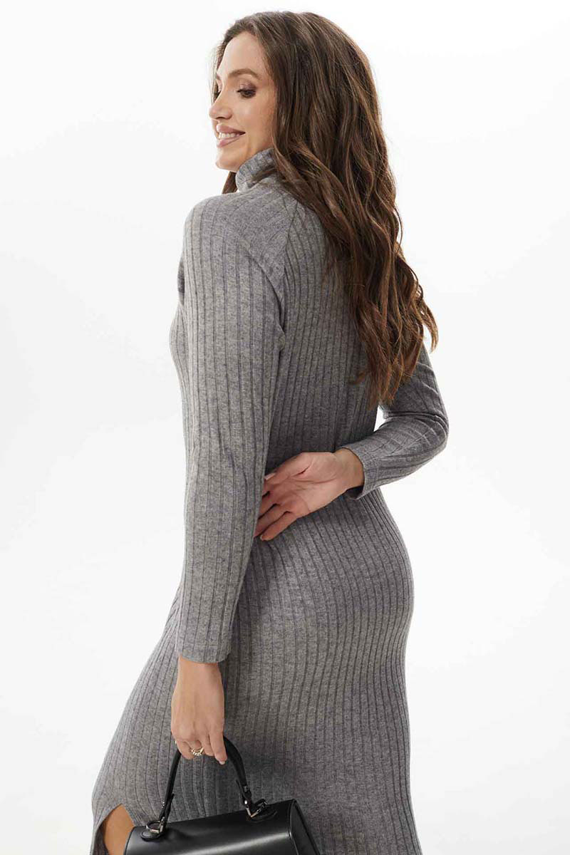 Платье из трикотажного полотна, полуприлегающего силуэта. Воротник стойка. Рукав - реглан с вытачкой по плечу. По переду боковой рельеф, заканчивающийся разрезом.