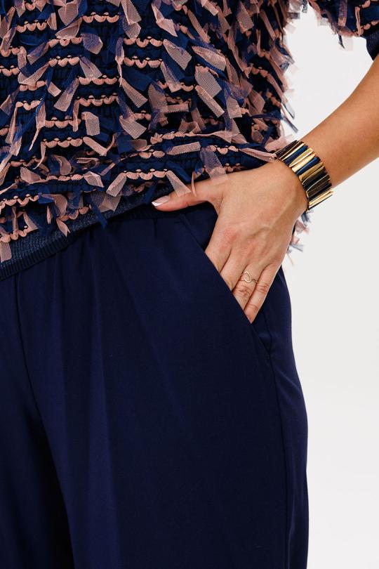 Брюки палаццо, на притачном поясе с резинкой и тесьмой. У брюк - боковые карманы.