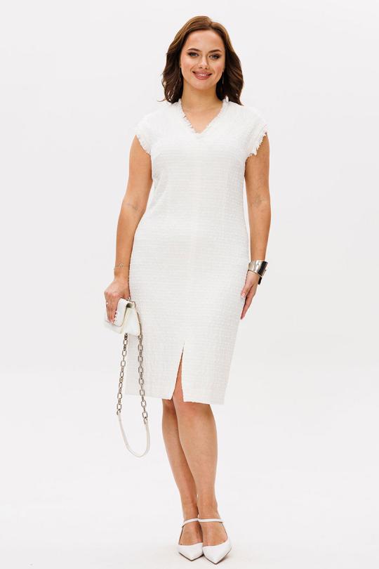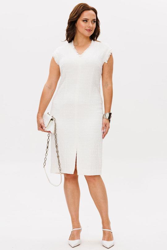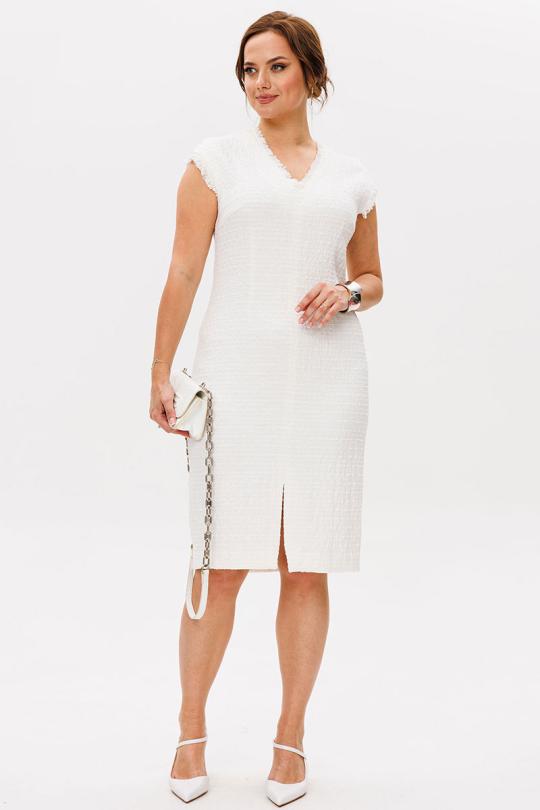 Платье женское прилегающего силуэта. Головина v-образная. Перед платья со средним швом, заканчиающимся разрезом. Спинка со средним швом, в который вшита потайная молния. Горловина и пройма изделия обработаны декоративной тесьмой. Платье без подкладки.