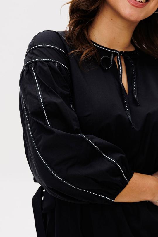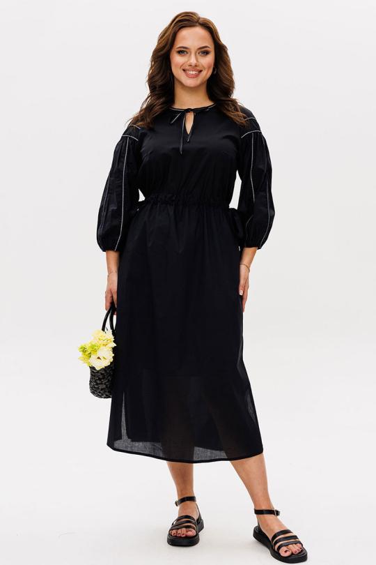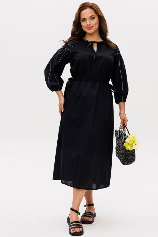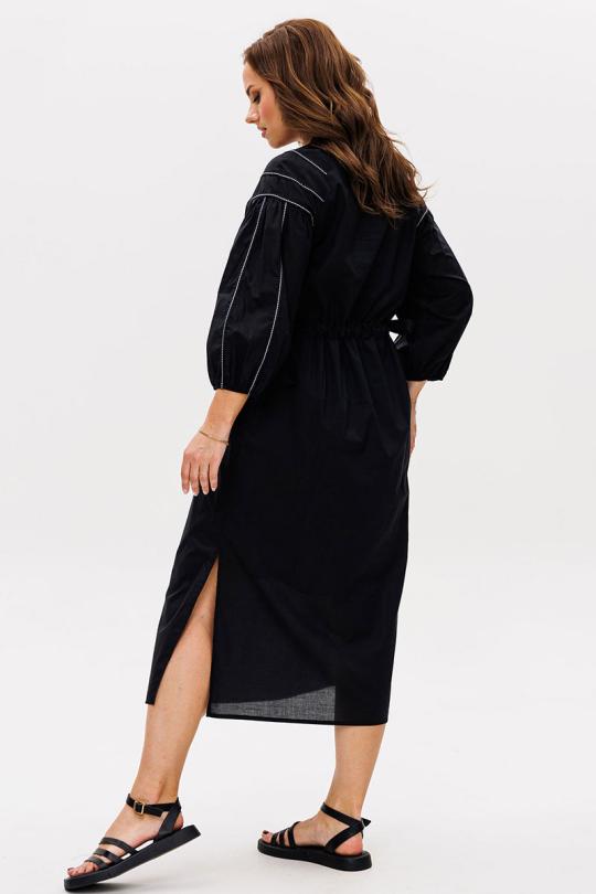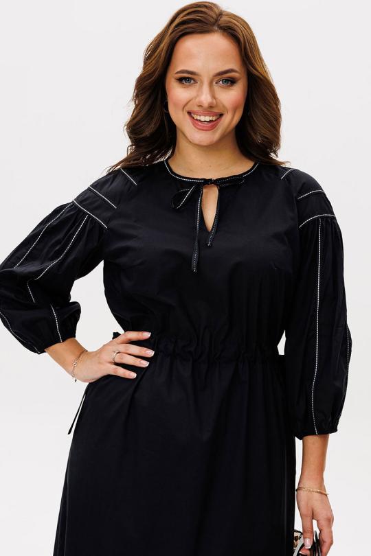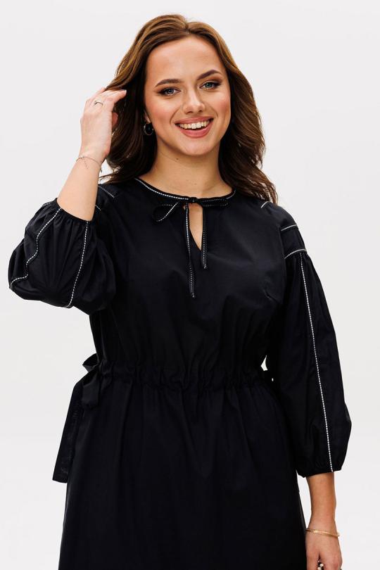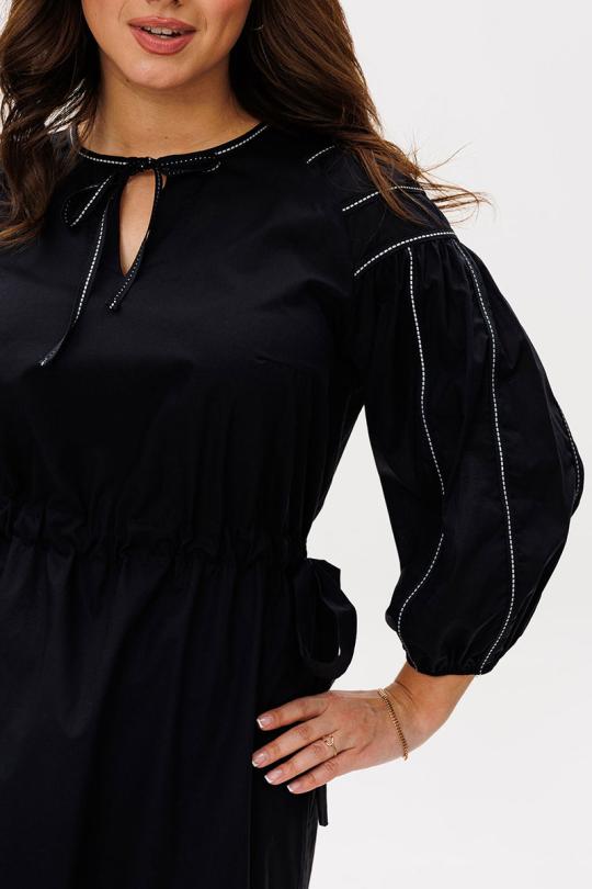 Платье А-силуэта с кулисой по линии талии. В кулису втянута лента, завязывающаяся по бокам. В боковых швах - разрезы. Рукав реглан, отрезной в области плеча, с настроченной отделочной тесьмой. По верху нижней части рукава - сборка. Рукав внизу на резинке. Настрочена тесьма. Горловина круглая, с вырезом "капелька" на завязке из отделочной тесьмы. Платье на подкладке от линии талии.