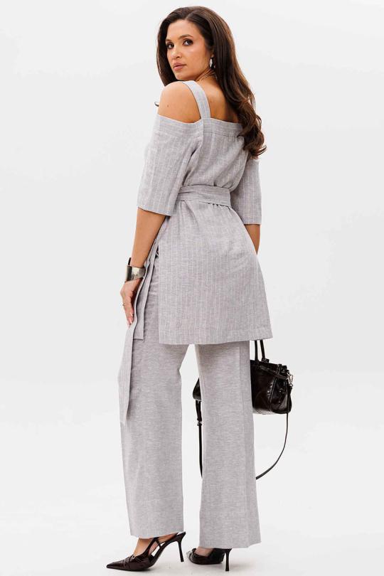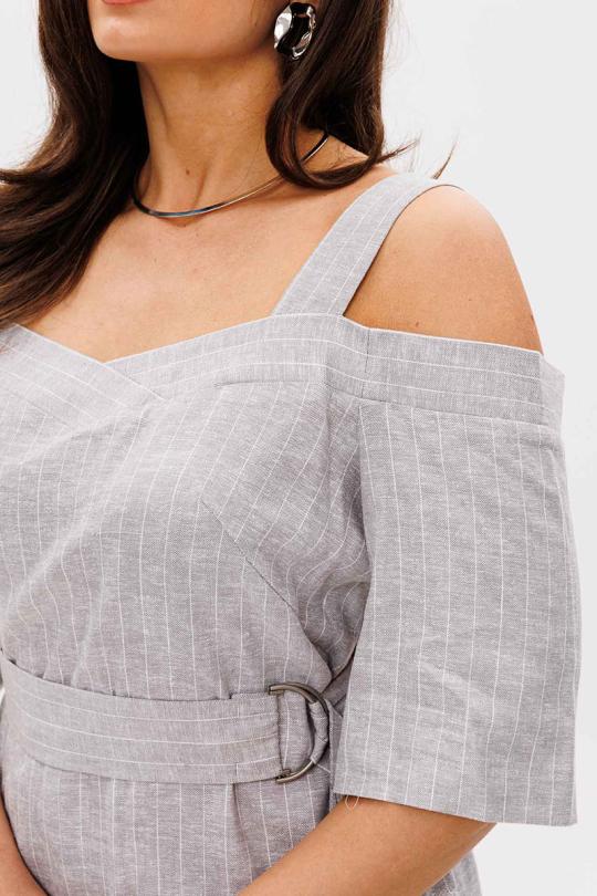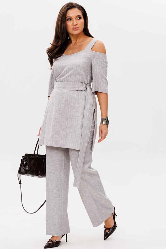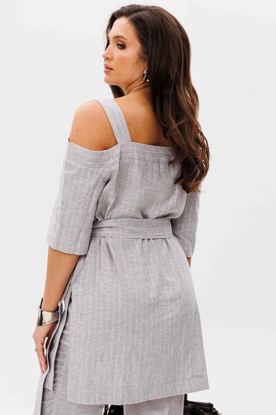 Блуза прямого силуэта, с разрезами по бокам. Рукав втачной, до линии локтя. Блуза на широких бретелях в области белья. Горловина V-образная с притачной планкой по линии переда, спинки и рукава. Блуза с поясом под пряжку.