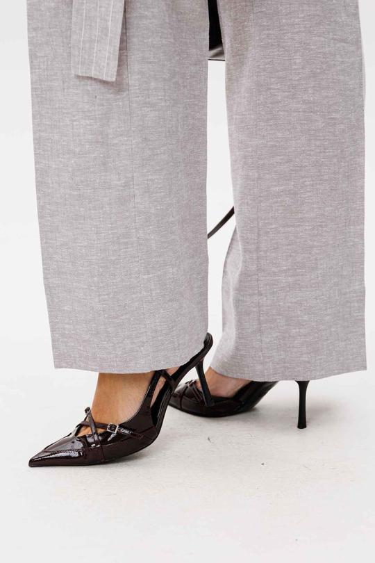Брюки по силуэту с легким клешем от колена, по низу отделочная широкая подгибка. Карманы боковые накладные. Брюки с застежкой на молнию. Притачной пояс застегивается на петлю-пуговицу и с резинками по бокам. Модель без подкладки.