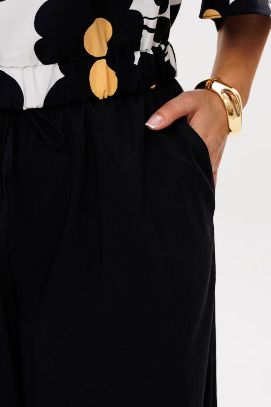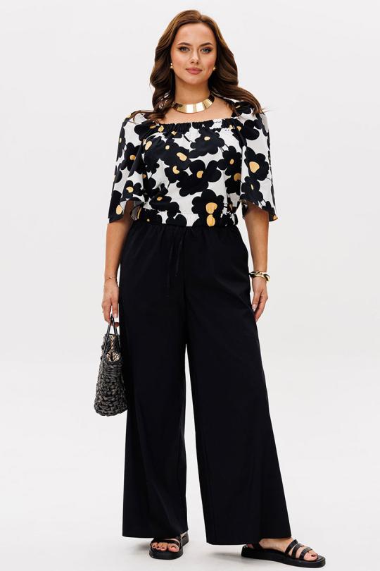 Брюки на резинке, свободные, прямые, с карманами в боковых швах.