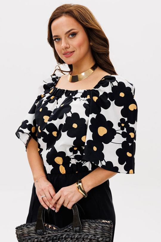 Рукав у блузы - реглан, со сбокой по окату. Рукав расширенный до линии локтя. По переду и спинке блузы - притачная планка с резинкой. Низ блузы с притачным поясом и резинкой.