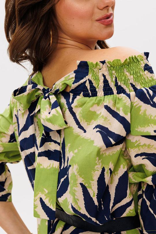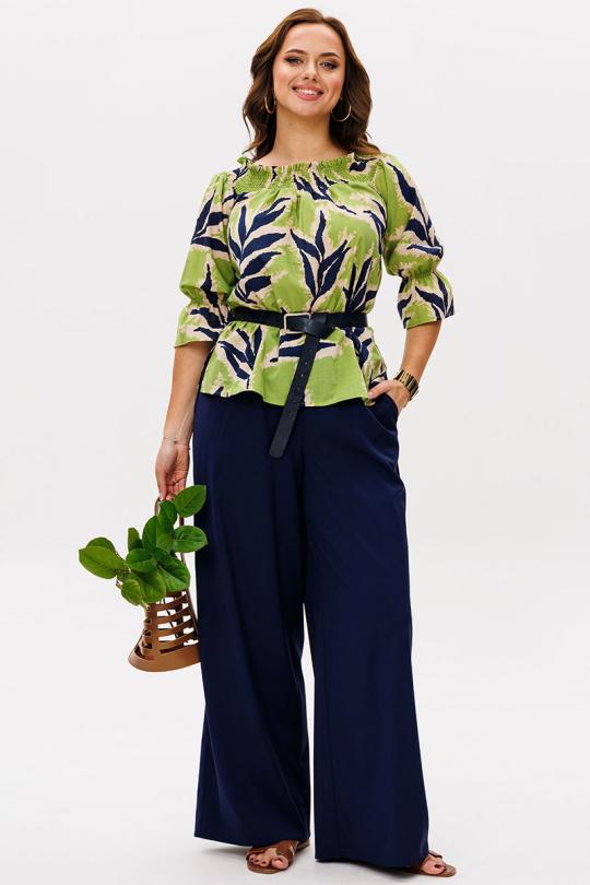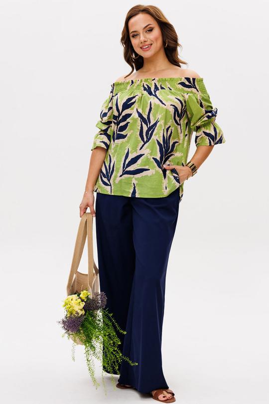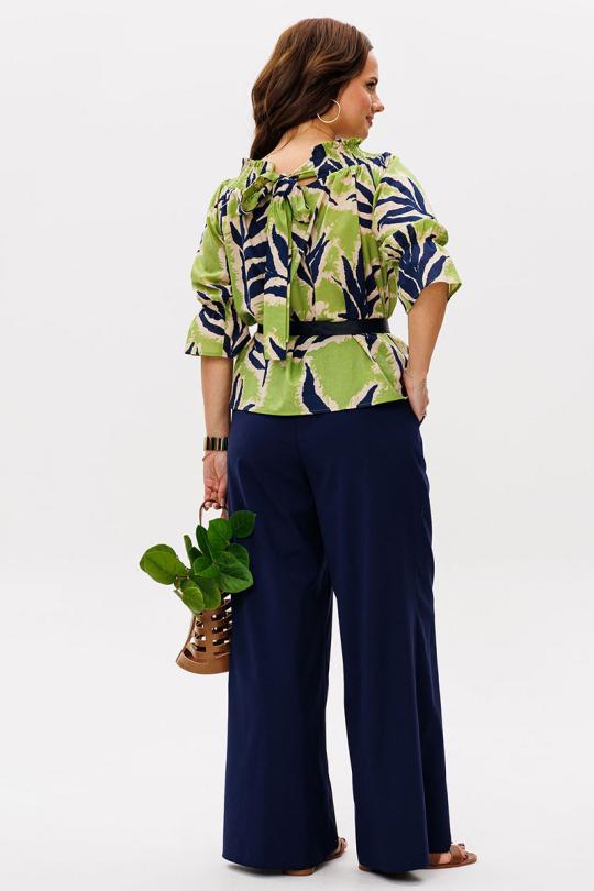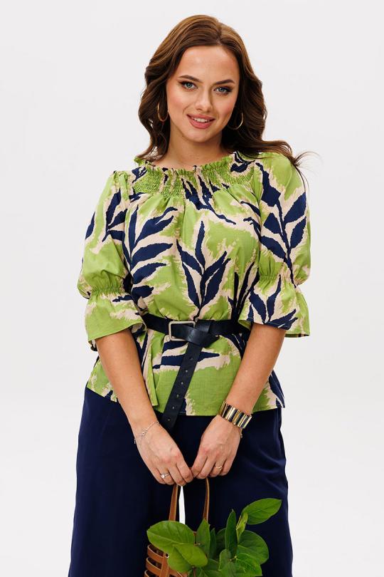 Блуза прямого свободного силуэта из хлопка, рукав 3/4. Низ рукава собран на резинку-венгерку, и образует красивый волан. По бокам блузы разрезы. По верху блузы притачная планка, собранная на резинку-венгерку, на спинке планка завязывается на бант.