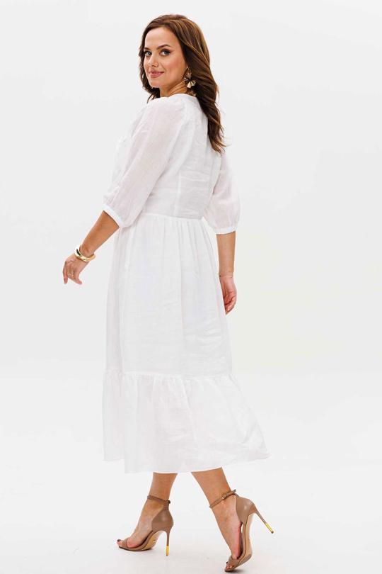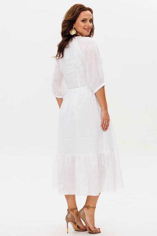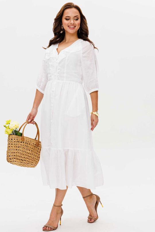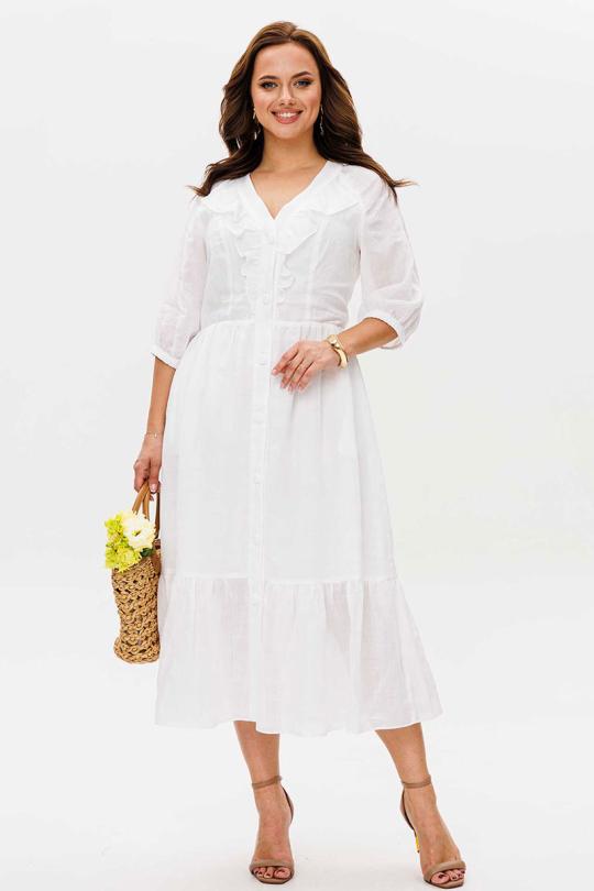 Платье женское полуприлегающего силуэта, отрезное по талии, отрезная присборенная рюша по низу изделия. Вдоль горловины притачная планка. Застежка по переду на петли-пуговицы. В области груди, частично по переду вдоль планки, обработаны рюшки. Рукав-реглан, по низу на резинке. Платье на подкладке, карманы в боковых швах.
