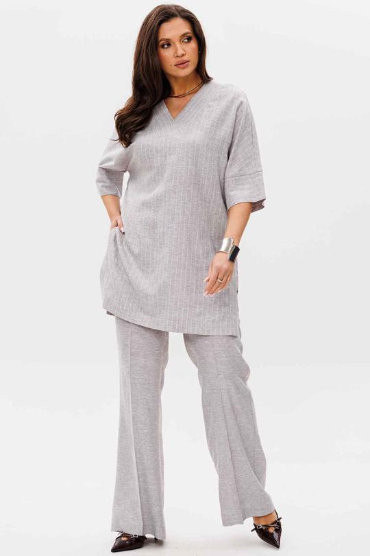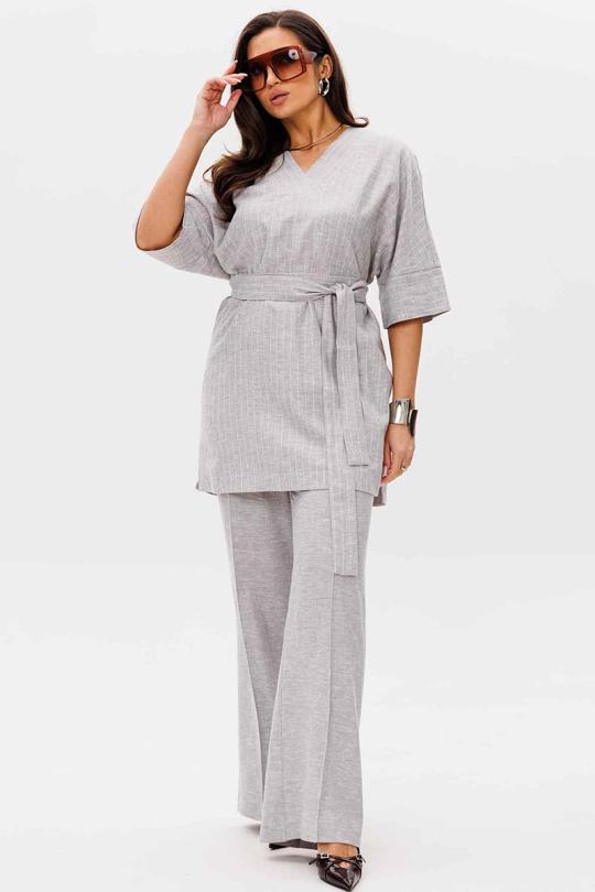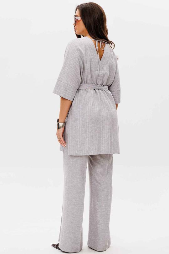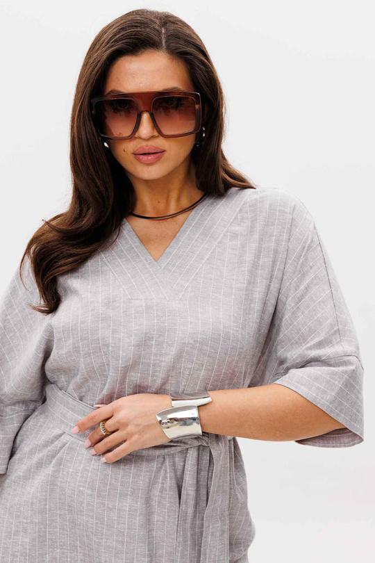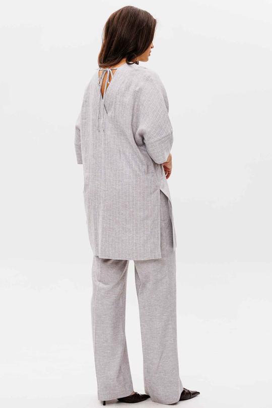 Блуза прямого силуэта, с разрезами по бокам. Рукав цельнокроеный, заканчивается притачной манжетой. Горловина V-образная с притачной планкой по линии переда, спинки и рукава. Головина на завязке. Дополнением служит пояс.