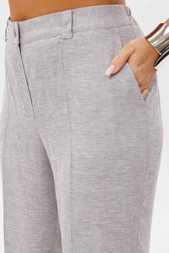 Брюки по силуэту с легким клешем от колена, по передним половинкам по центру застрочен защип. Карманы боковые накладные. Брюки с застежкой на молнию. Притачной пояс застегивается на петлю-пуговицу и с резинками по бокам. Модель без подкладки.