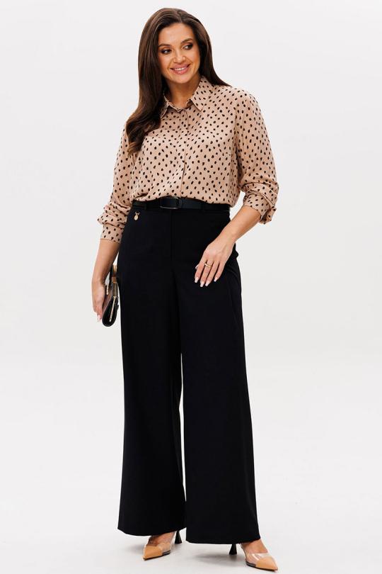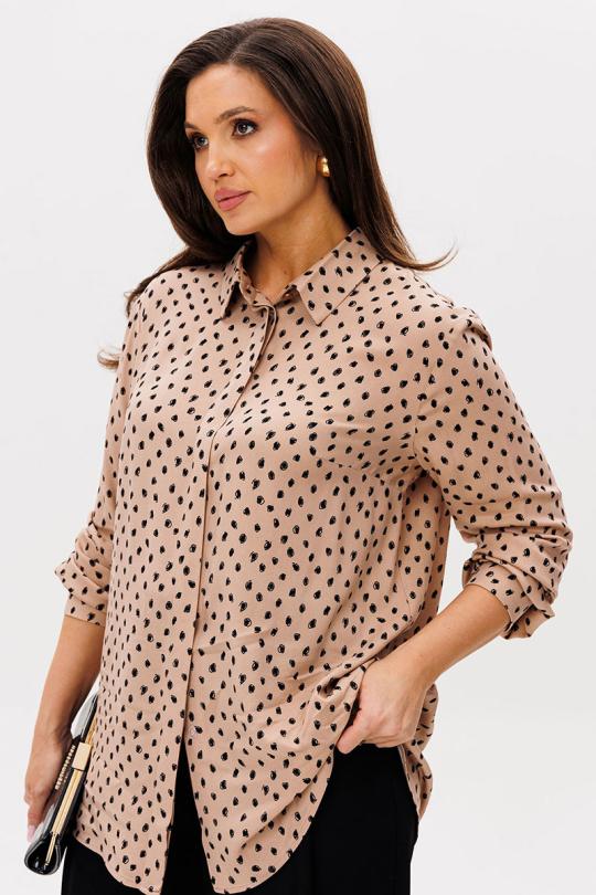 Блуза прямого силуэта с центральной потайной застежкой. Воротник стоячий отложной с отрезной стойкой. Перед с нагрудными вытачками. Спинка с отрезной кокеткой и встречной складкой по центру от кокетки. Рукав втачной, одношовный, рубашечного типа. По низу рукава обработанный разрез, две складки и притачная манжета с застежкой на две пуговицы. У блузы фигурный низ.