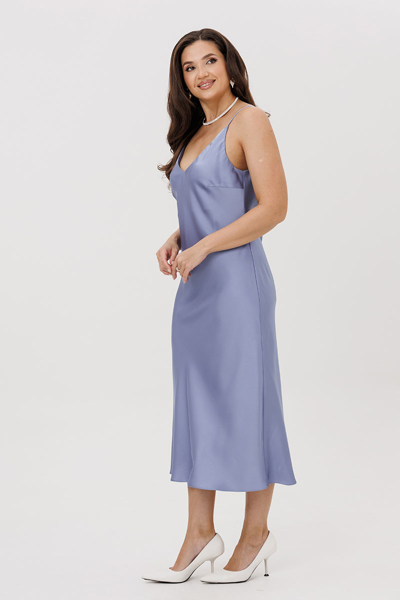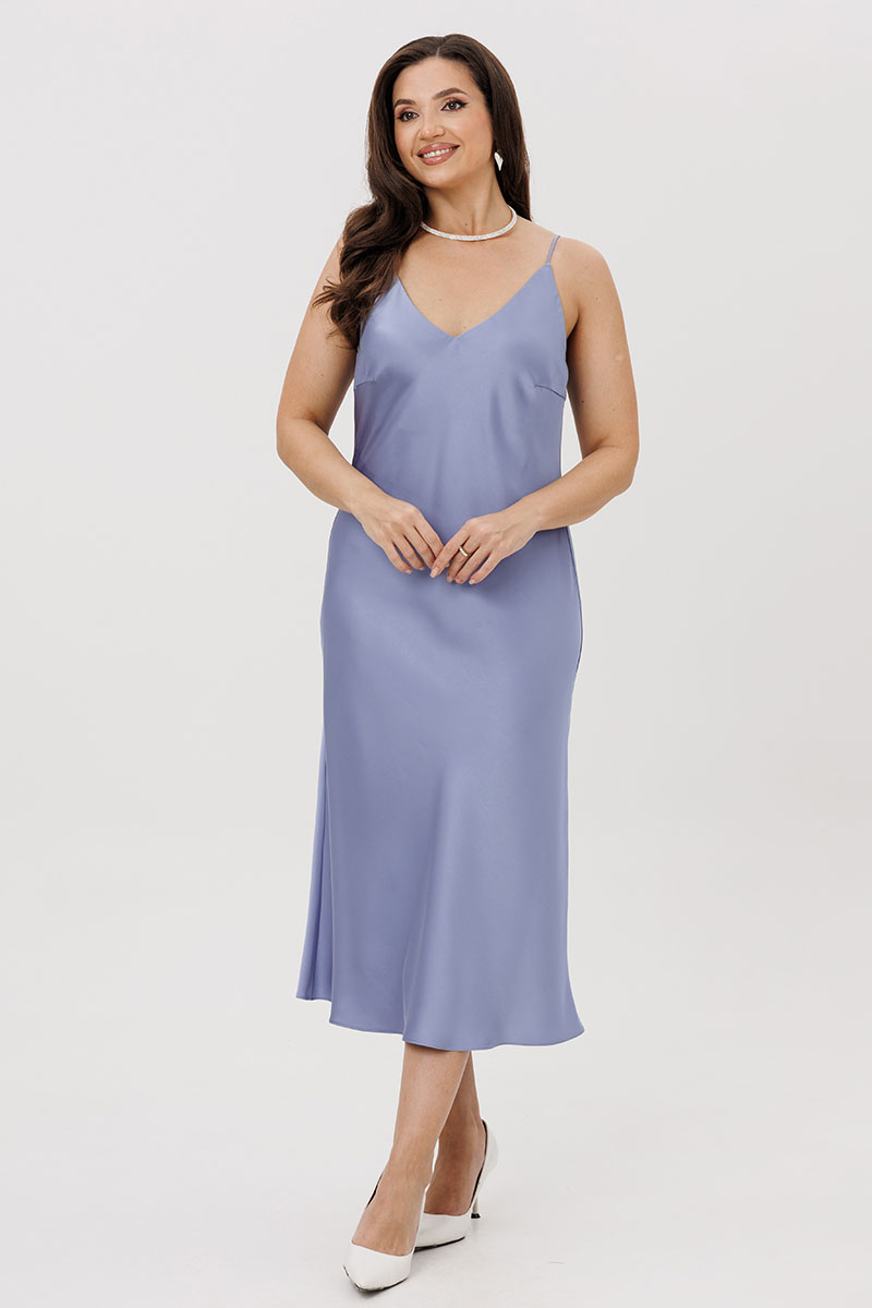 Платье полуприлегающего силуэта, расклешенное к низу. Перед с нагрудными вытачками. Платье на нерегулируемых бретелях. Верх платья на обтачке. Дополняет модель тонкий пояс.