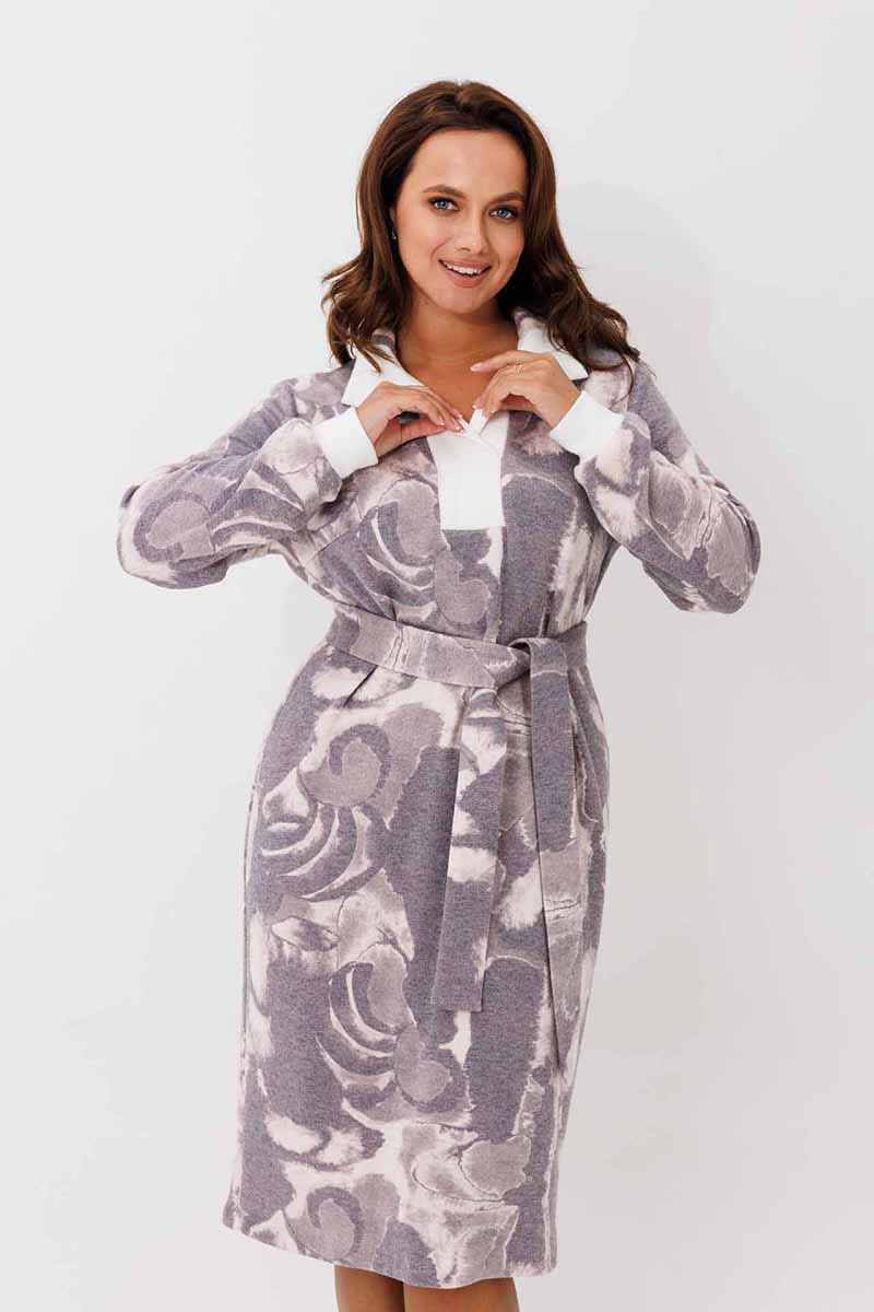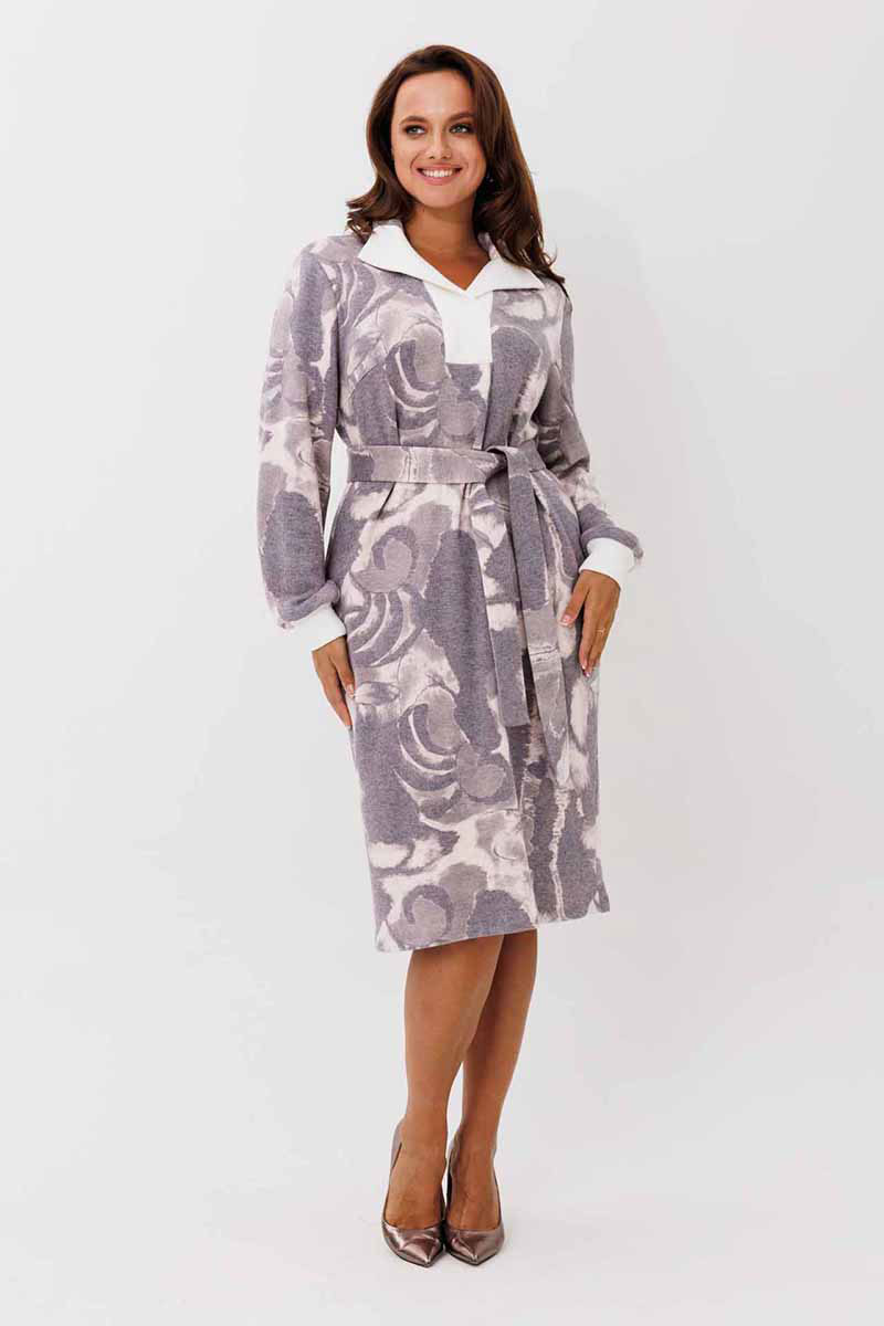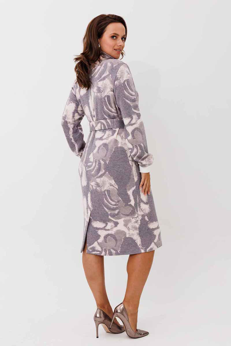 Платье из мягкого трикотажного полотна, женское, полуприлегающего силуэта. Длина миди. перед с нагрудными вытачками. спинка со средним швом, заканчивающимся шлицей. Рукава втачные, одношовные, с притачным манжетом по низу. горловина обработана втачной планкой и отрезной стойкой. Дополнят модель пояс.