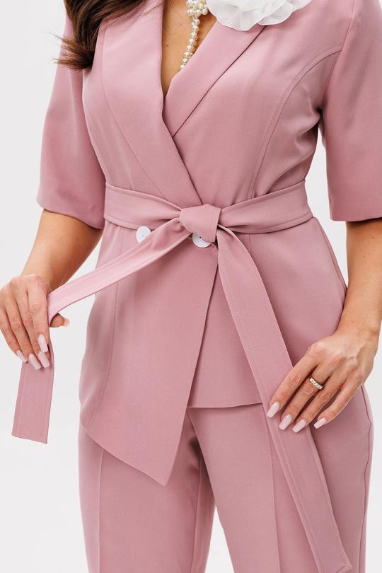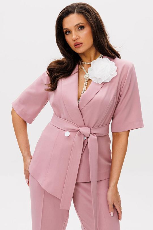 Жакет полуприлегающего силуэта, двубортный, с застежкой на две пуговицы. Воротник английский. Рукав втачной, длиной до локтя. По бокам рельефные швы, формирующие силуэт. На уровне груди предусмотрены нагрудные вытачки. Украшает модель съемный декоративный цветок.