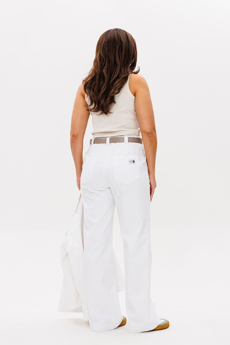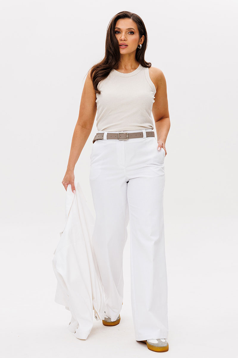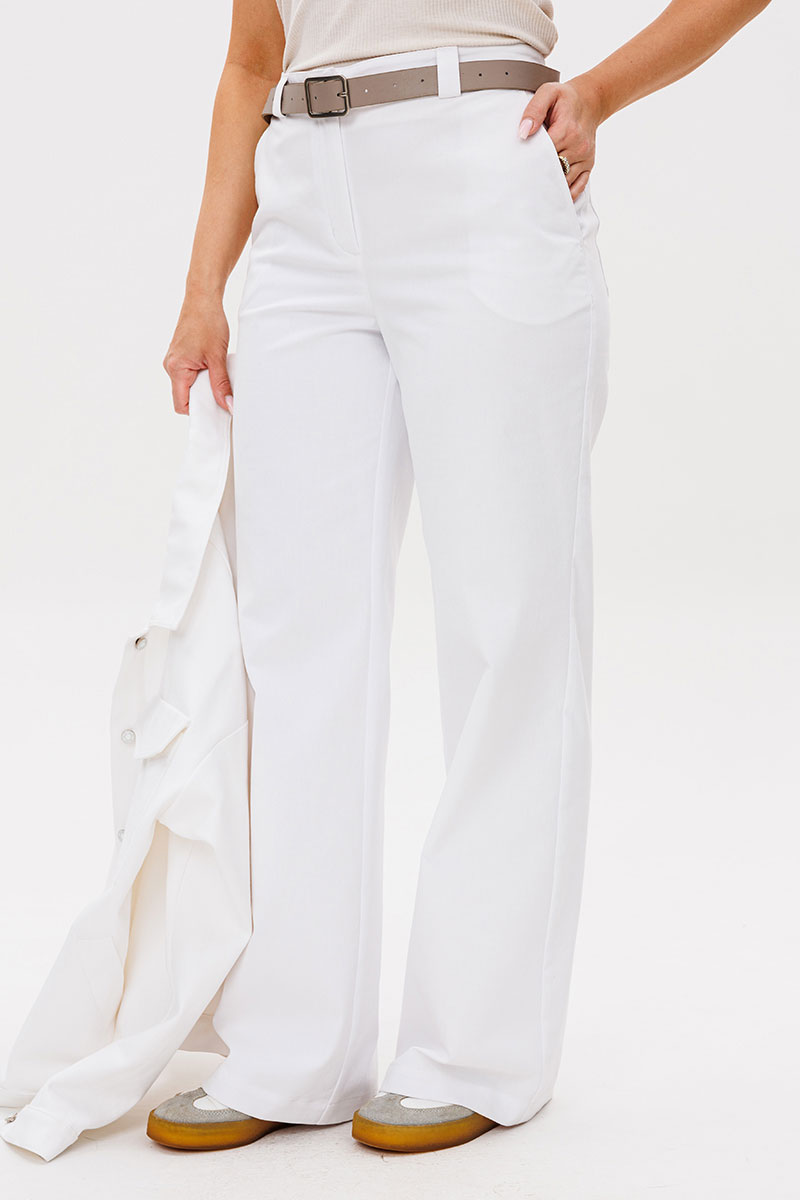 Брюки женские прямые, с высокой посадкой на притачном поясе со шлевками. На спинке в пояс вставлена резинка. Застежка на молнию с гульфиком и откоском. Брюки из тонкого джинса.