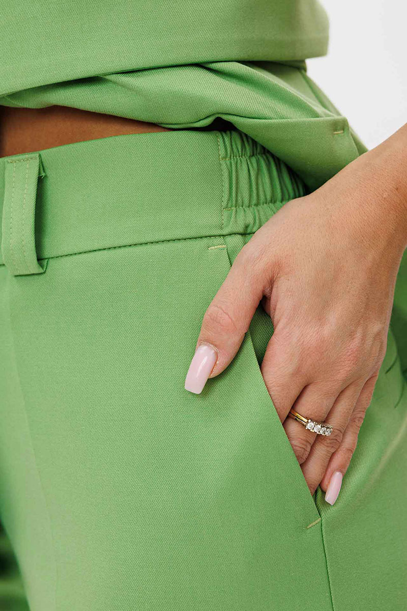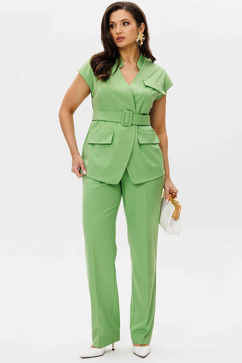 Брюки прямого силуэта, слегка зауженные к низу. Пояс частично на резинке (по бокам), с шлевками для ремня. Застежка на гульфик с молнией и внутренним крючком. По бокам боковые карманы с косым входом, сзади декоративные прорезные карманы «в рамку». Материал костюма костюмный, средней плотности, с гладкой фактурой. Без подкладки. Дополняет модель широкий пояс.