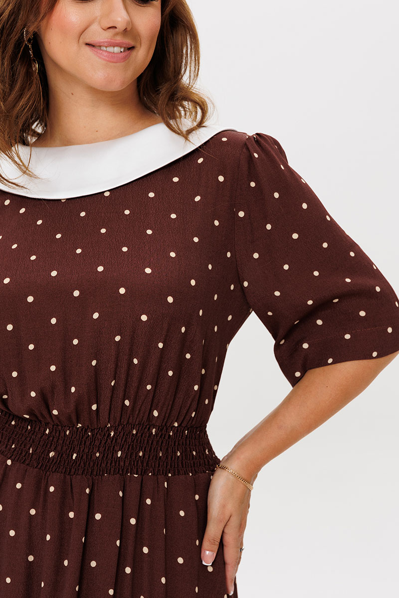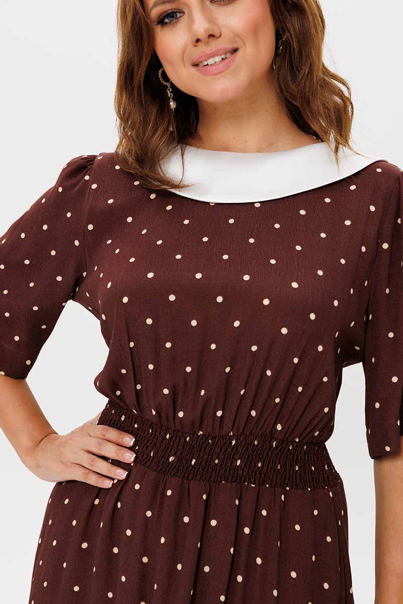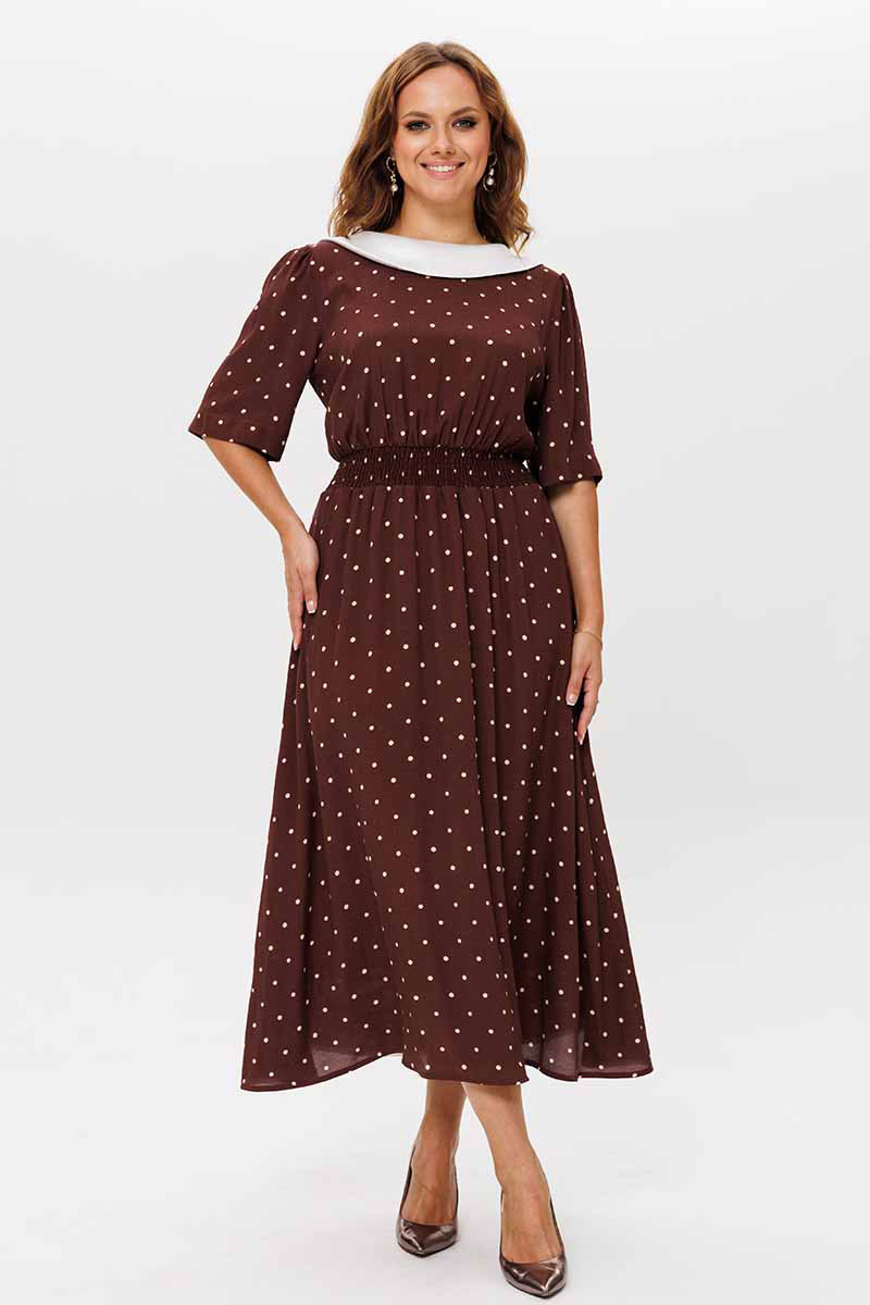 Платье полуприлегающего силуэта, расклешенное к низу, отрезное по линии талии со вставленным поясом на "венгерке". Рукав одношовный, втачной. Воротник плосколежащий, переходящий на спинке в рельефы, заканчивается бантом. Застежка на тесьму-молнию в среднем шве спинки до воротника.
