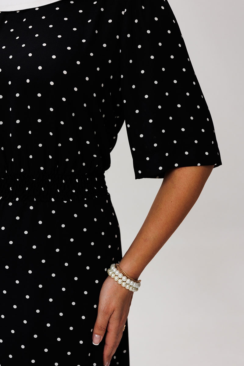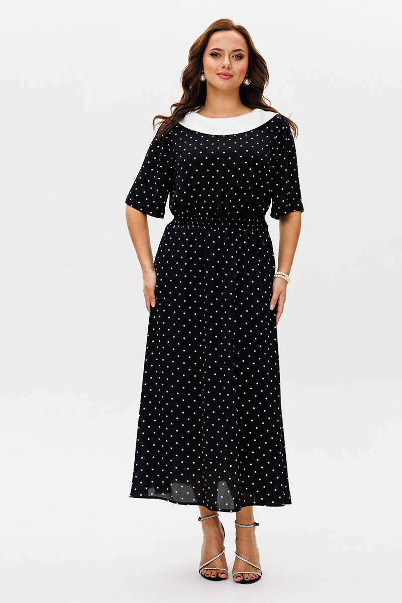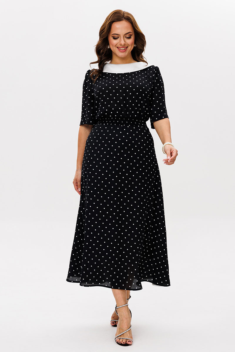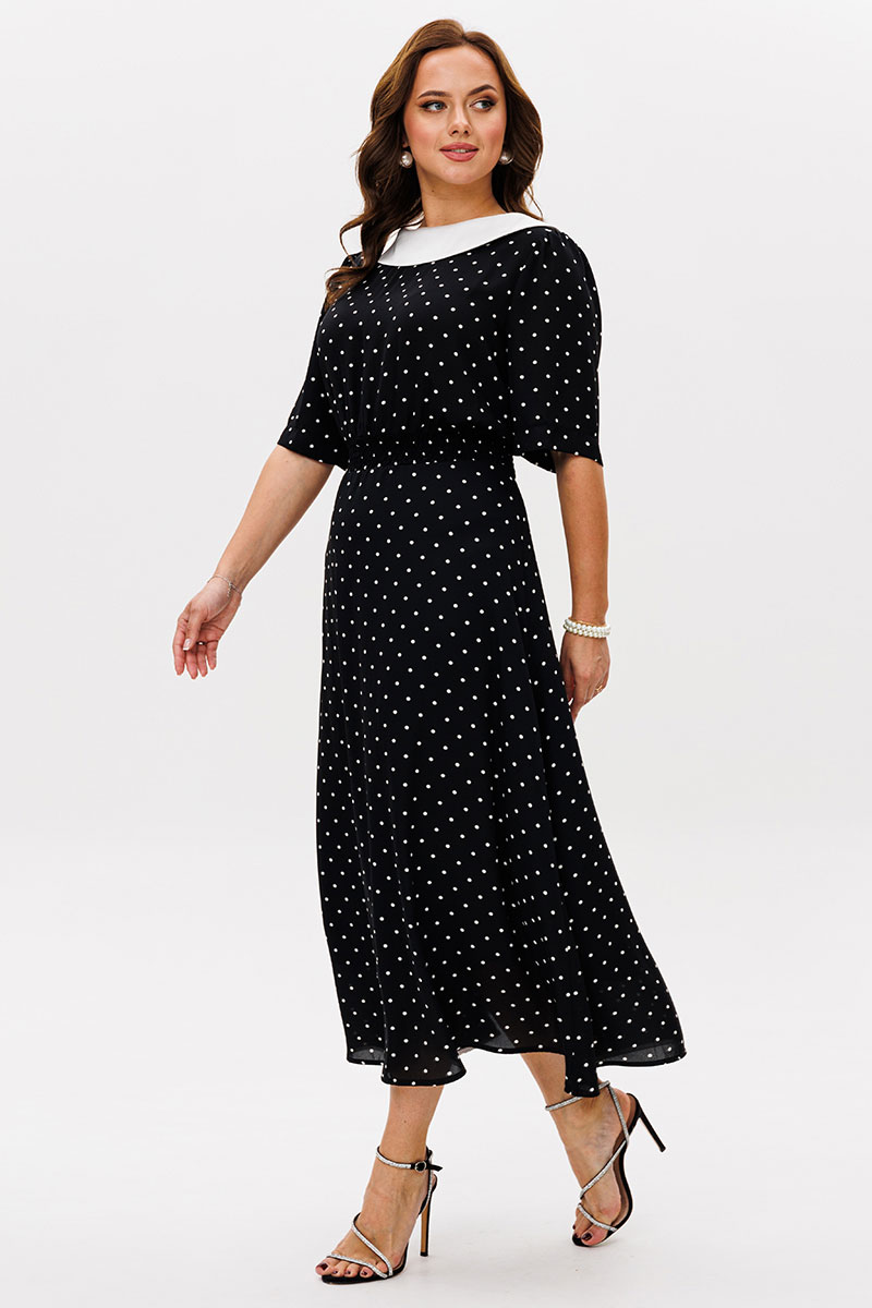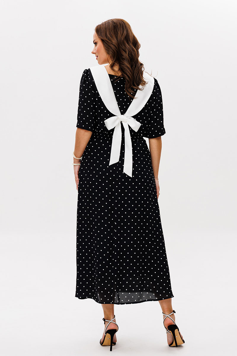 Платье полуприлегающего силуэта , расклешенное к низу, отрезное по линии талии со вставленным поясом на "венгерке". Рукав одношовный, втачной. Воротник плосколежащий, переходящий на спинке в рельефы, заканчивается бантом. Застежка на тесьму-молнию в среднем шве спинки до воротника.